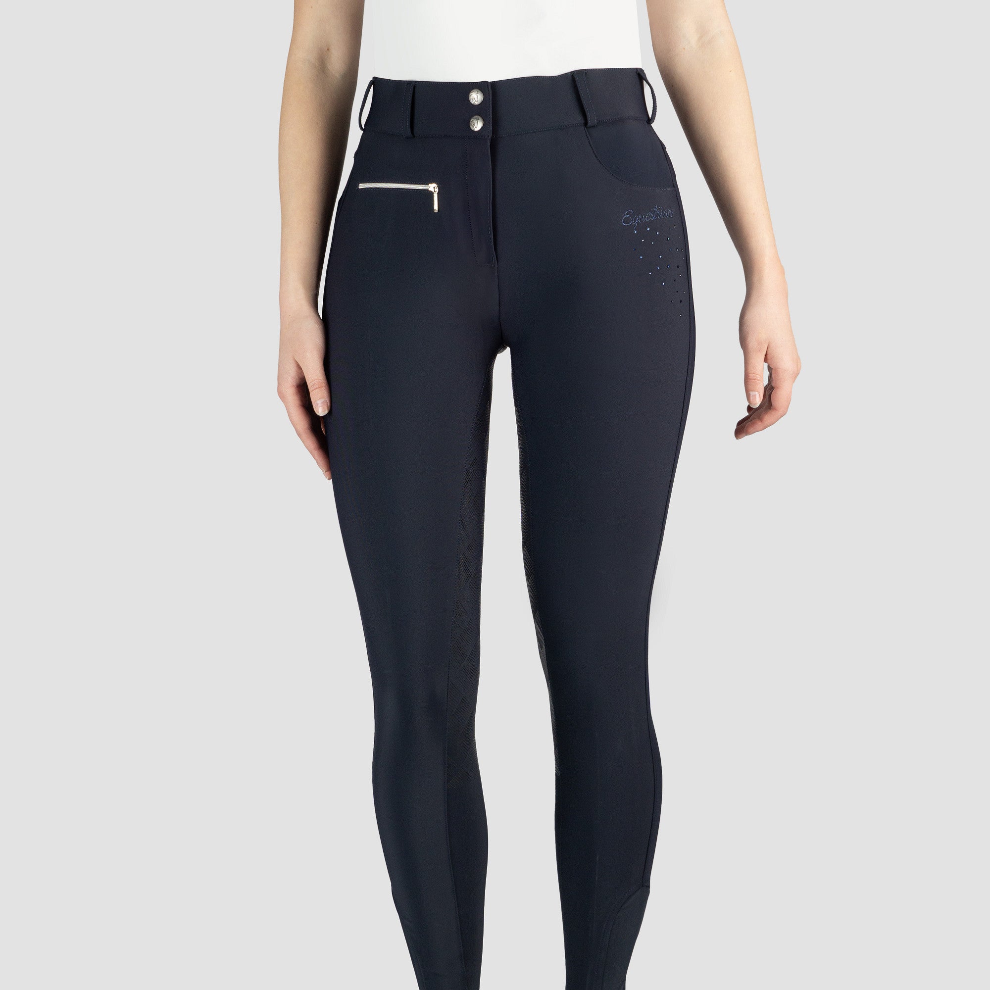 Exclusieve damesrijbroek Kiana is gemaakt van een zeer hoogwaardige technische stof. De broek heeft een siliconen zitvlak voor extra grip in het zadel. Productspecificaties: Waterafstotende vochtafvoerende en ademende stof met UV bescherming Glitter borduur details Twee voorzakken riemlussen en 2 V vormige achterzakken Voorzakken zijn diep genoeg zijn voor een mobiele telefoon Matte siliconen zitvlak Materiaal: Buitenkant: 82% Nylon 18% Spandex. Binnenkant: 90% Polyester 10% Spandex Let op! De maten in de huidige voorraad vallen ruim daarom raden wij aan om een maat kleiner te bestellen.