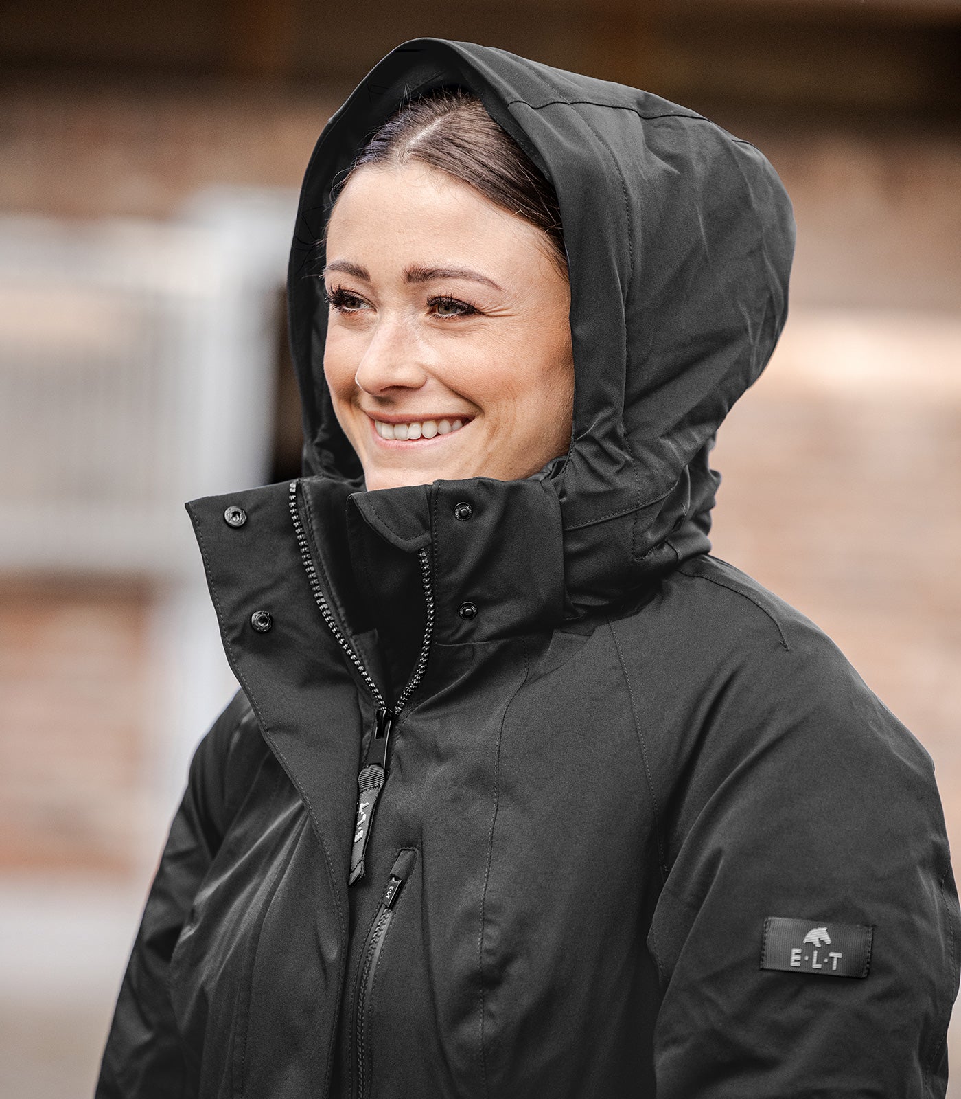 - Twee grote opgestikte zakken met drukknopen en handwarmende fleecevoering. Rechterzak met E·L·T Equestrian Performance-opschrift