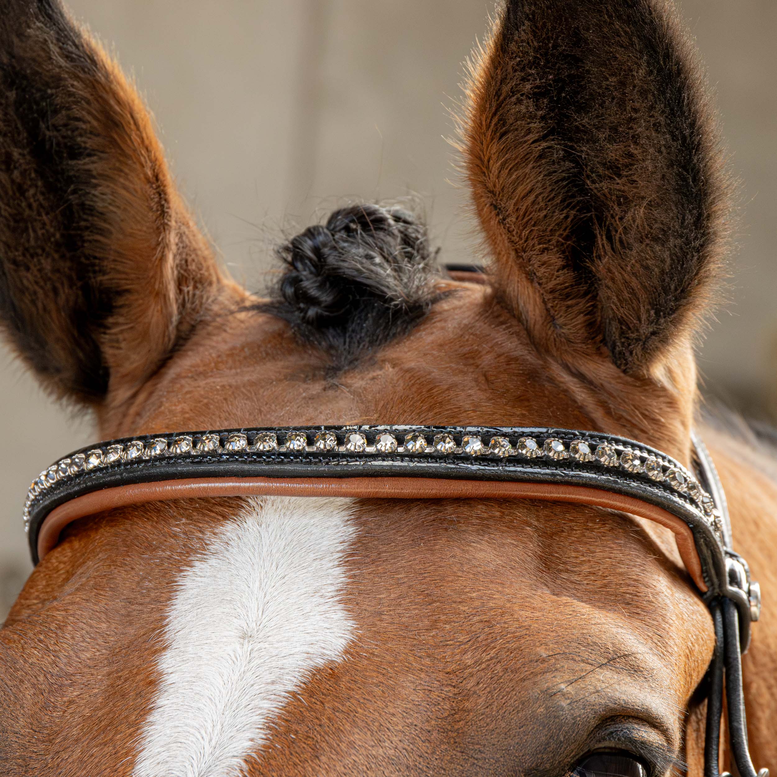 Lederen hoofdstel met anatomisch gevormd kopstuk en aansnoerneusriem. Afgewerkt met croco lak op neusriem en frontriem. De frontriem is ingelegd met cognackleurige kristallen en het hoofdstel is onderlegd met cognackleurig leer.