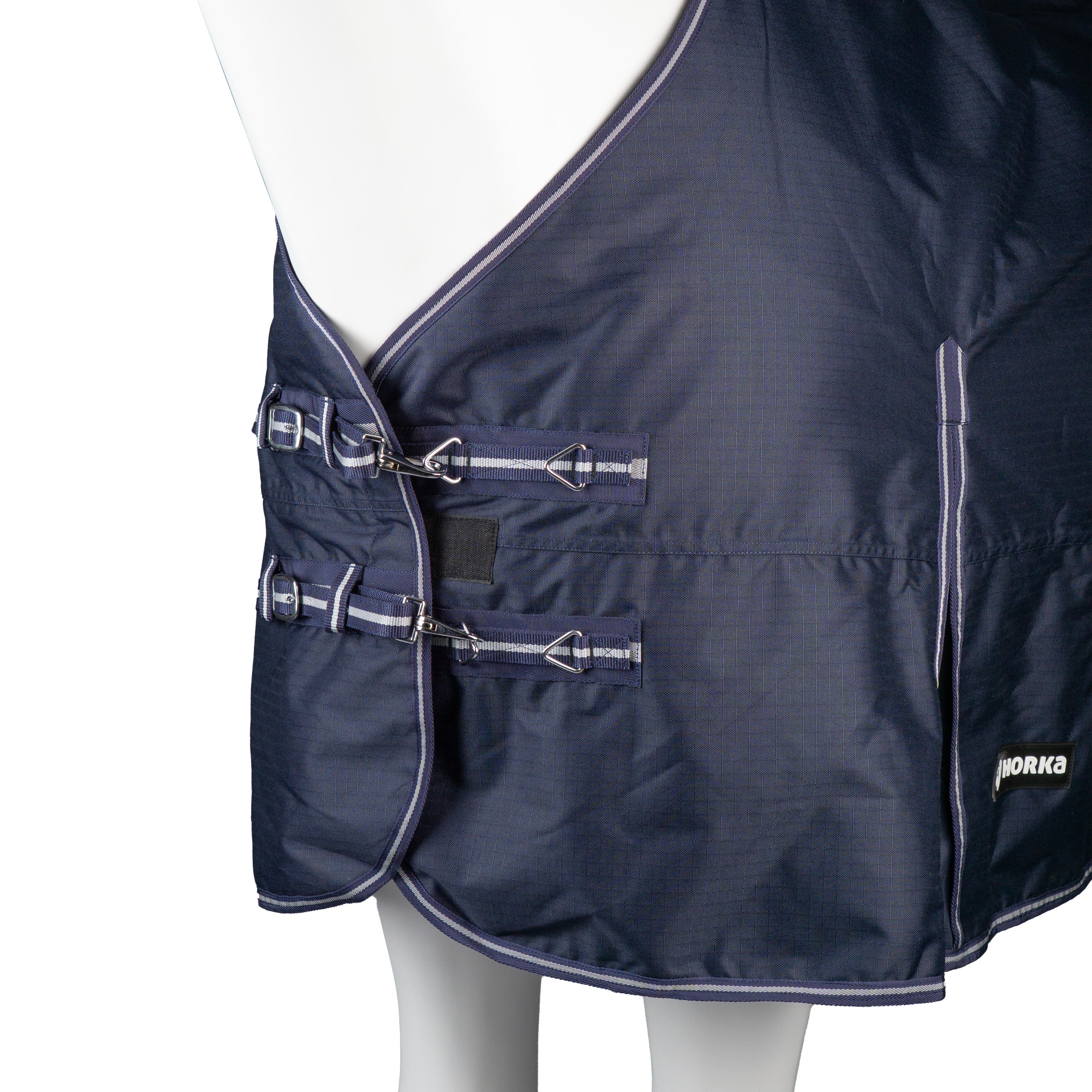 100 grams lichtgewicht deken uitgevoerd met schoftbeschermer dubbele borstsluiting kruissingels en afneembare bilkoorden. Productspecificaties: 600D rip stop polyester 3000 mm waterdicht en 3000 mvp ademend 100 grams vulling polyester voering Dubbele haaksluiting en klittenband op de borst Kruissingels met elastisch uiteinde en rubberen stops Afneembare bilkoorden Schoftbeschermer