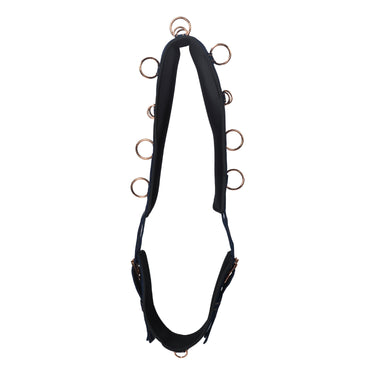 Nylon longeersingel met neoprene voering en kussens op de schoft om schuiven en draaien te voorkomen. Afgewerkt met lurex lijnen in de longeersingel voor een luxere look. Productspecificaties: < 3 grote ringen en 2 D ringen aan elke kant Midden op de schoft 1 grote ring en 2 D ringen 2 D ringen op het midden van de singel Aan 2 zijden aan te singelen met rolgespen Materiaal: < Nylon en neoprene
