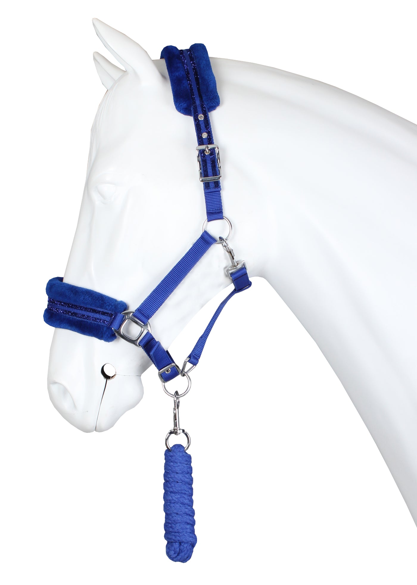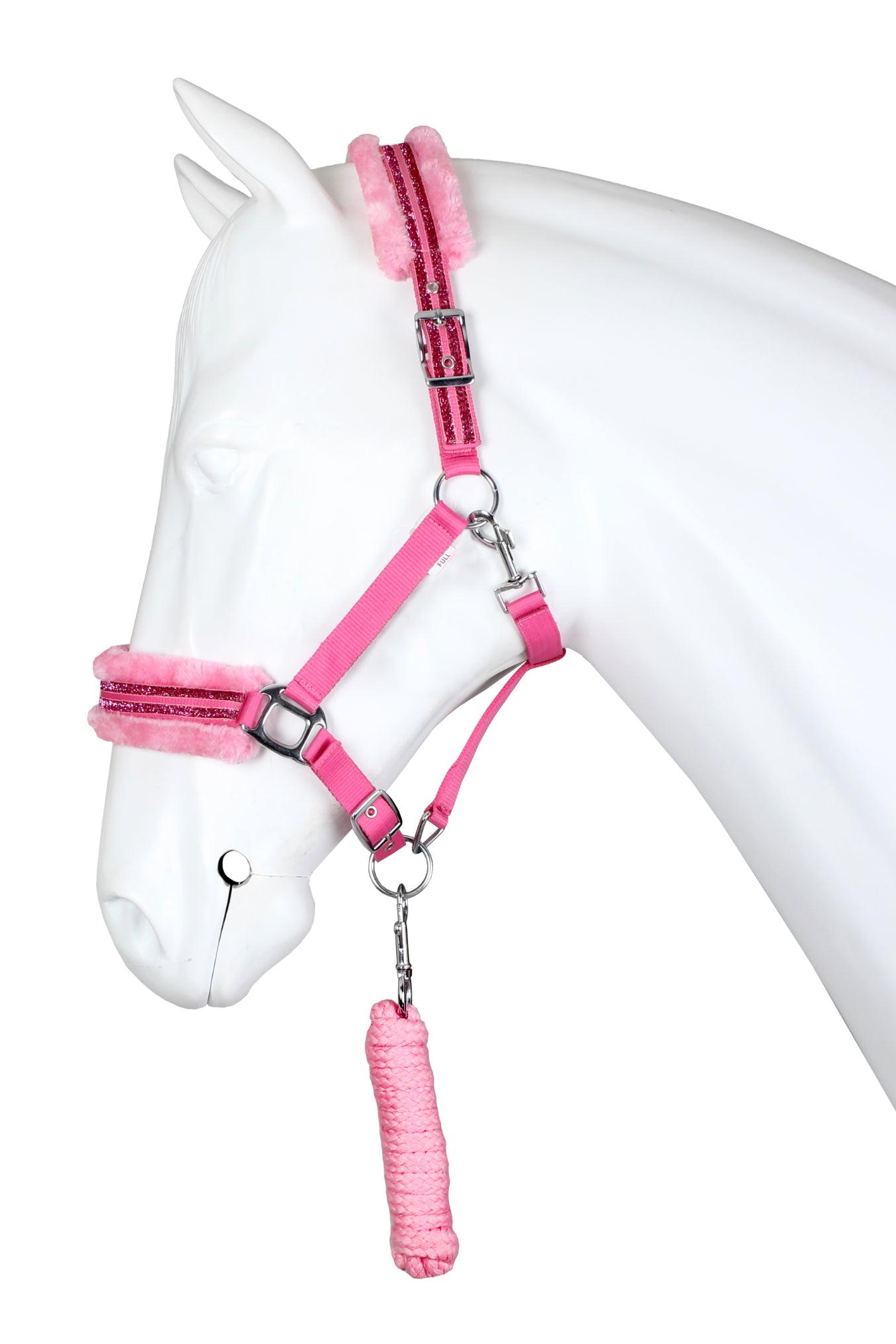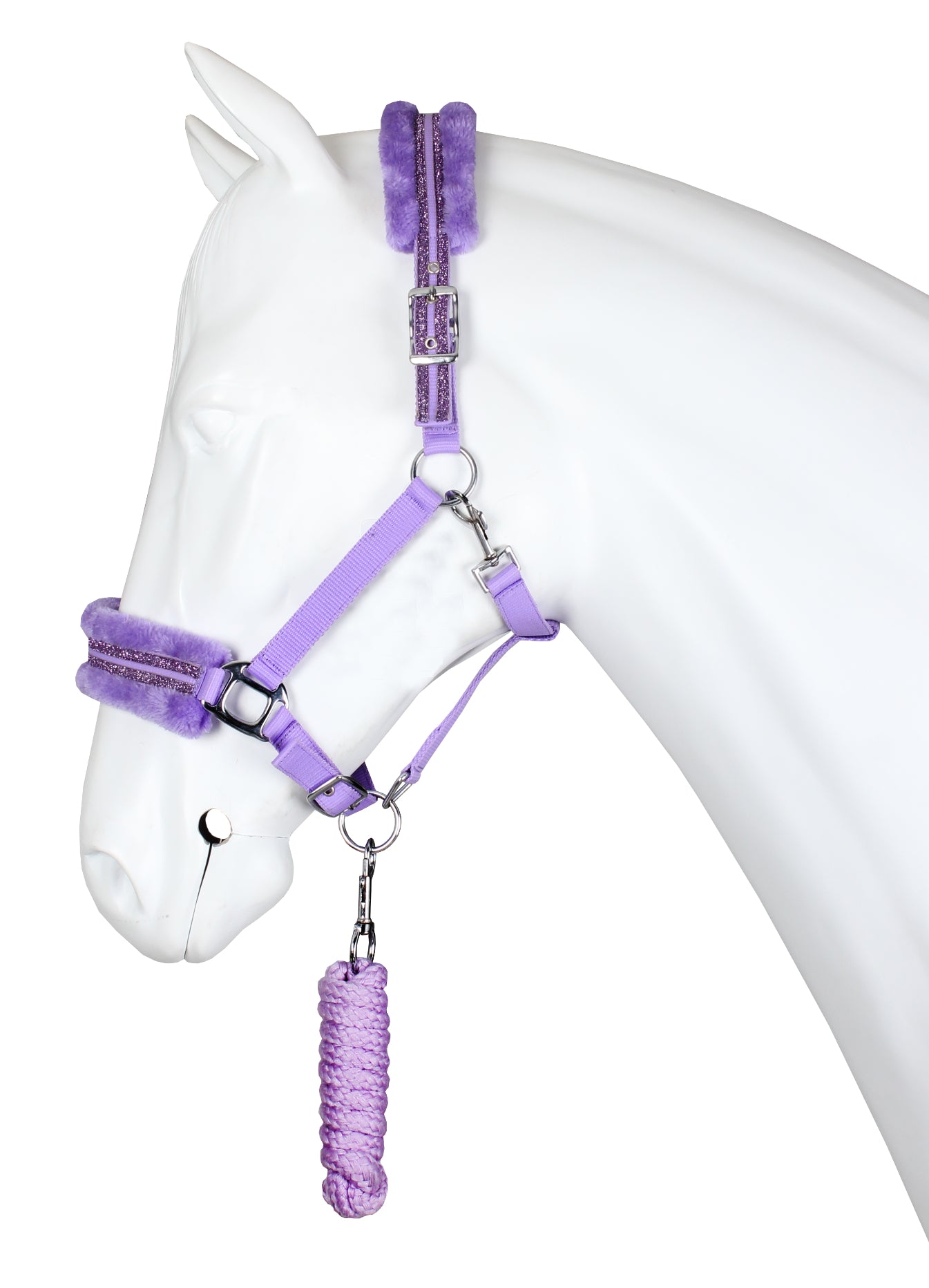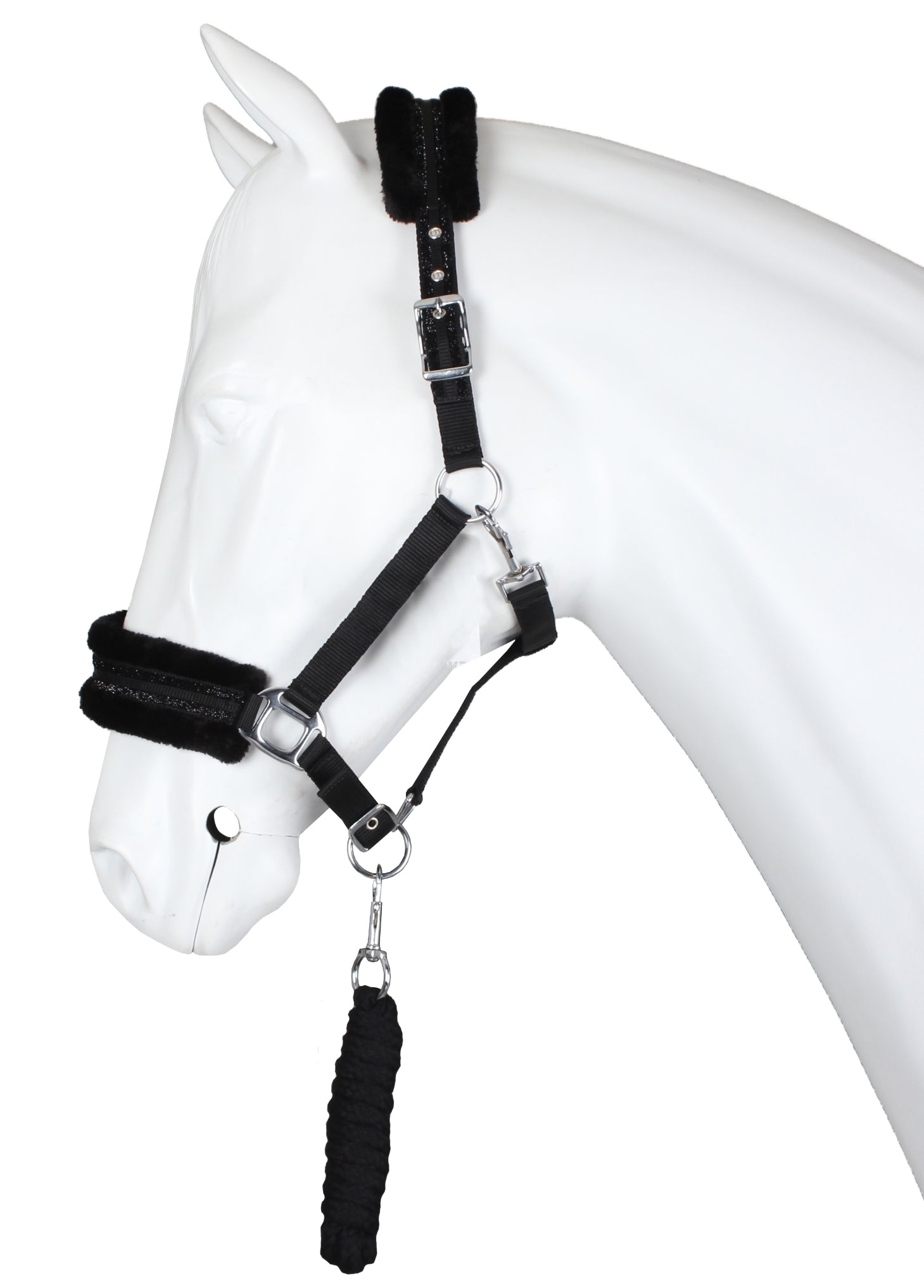 Halster set met zachte teddy fleece padding en dubbele glitter rand. Productspecificaties: PP halster Kopstuk en neusriem gevoerd met teddy fleece Dubbele glitter rand over de neusriem en kopstuk Kopstuk aan 2 zijden verstelbaar met gesp Verstelbare neusriem Incl. halster touw van 200 cm