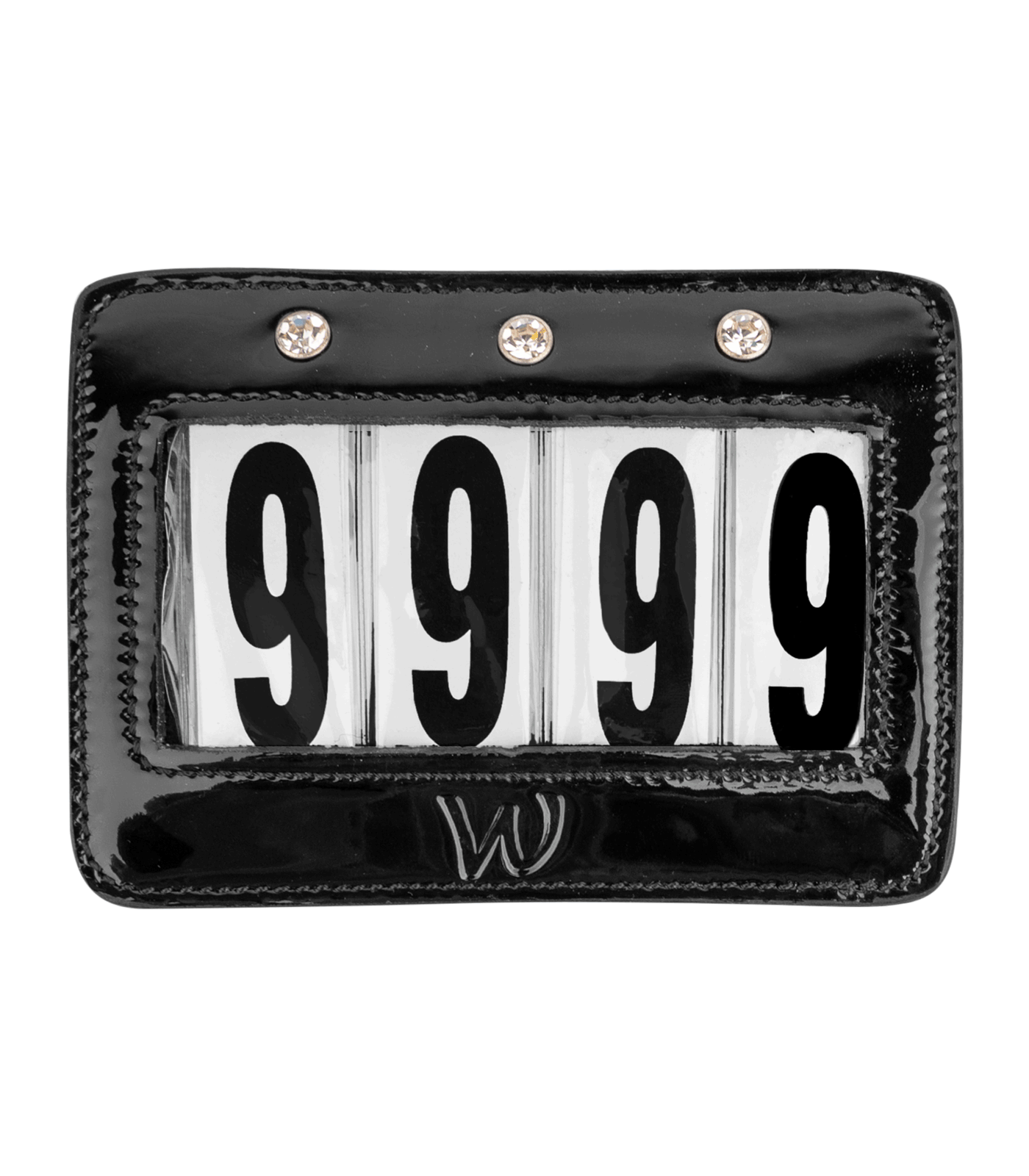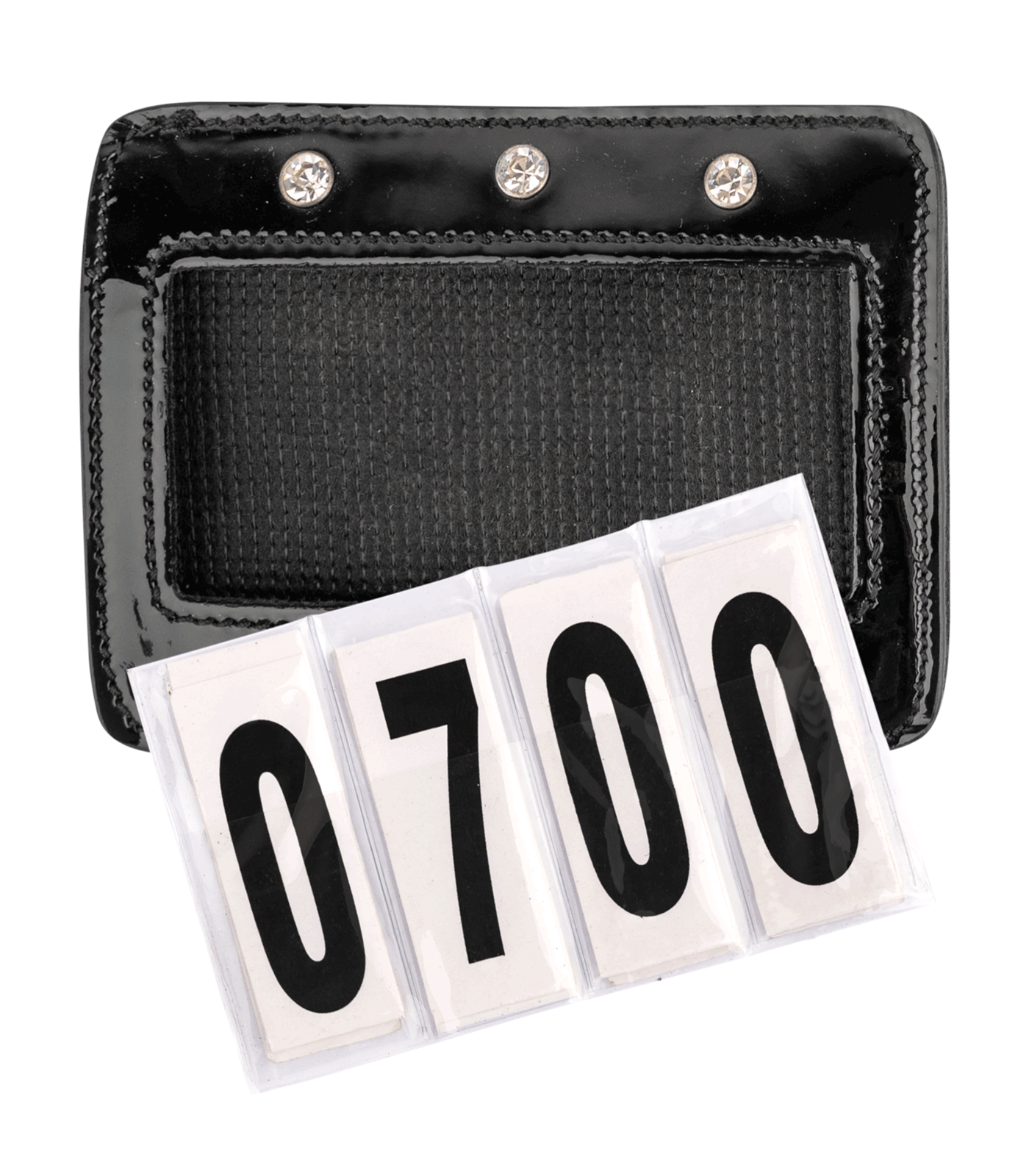 Competition numbers made of soft patent leather with beautiful rhinestones. Simple changing of competition numbers. Adjustable from 1-9999. Easy to attach to the saddle pad with a large safety pin. Pair