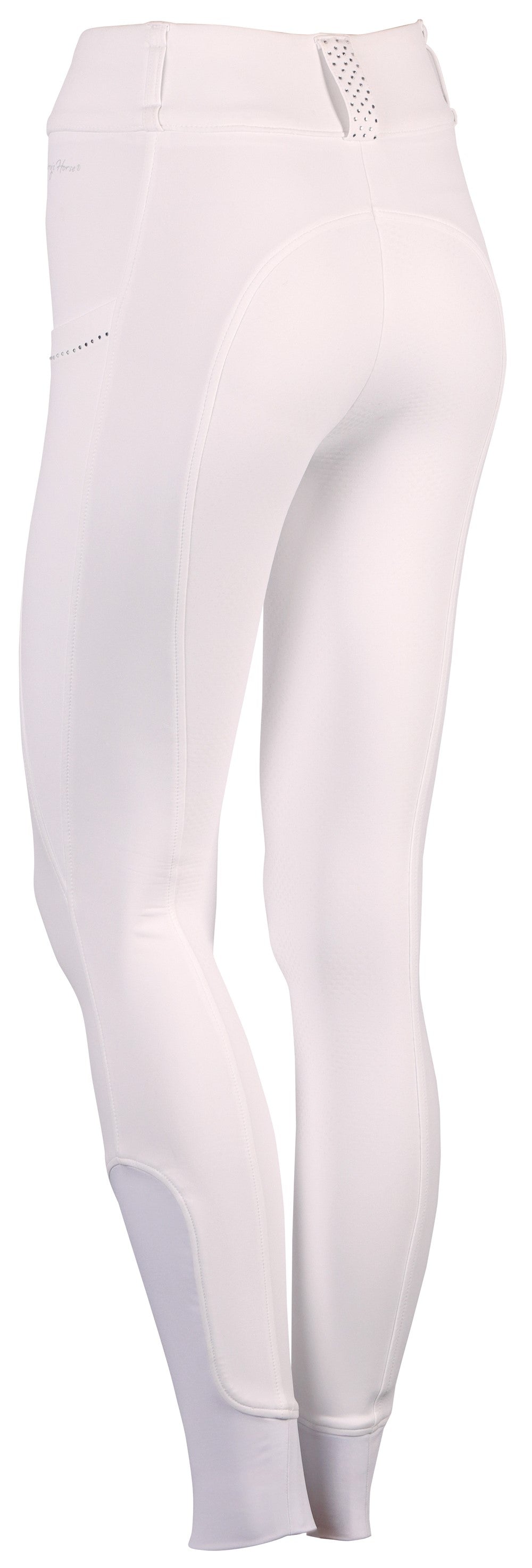 Paardrijlegging met een hoge tailleband met riemlussen waarvan een brede op de achterkant gedecoreerd met kristallen, twee steekzakken met kristallen, rondgenaaid zitvlak met een siliconen print voor extra grip in het zadel en een elastische inzet rond de enkels voor meer comfort.