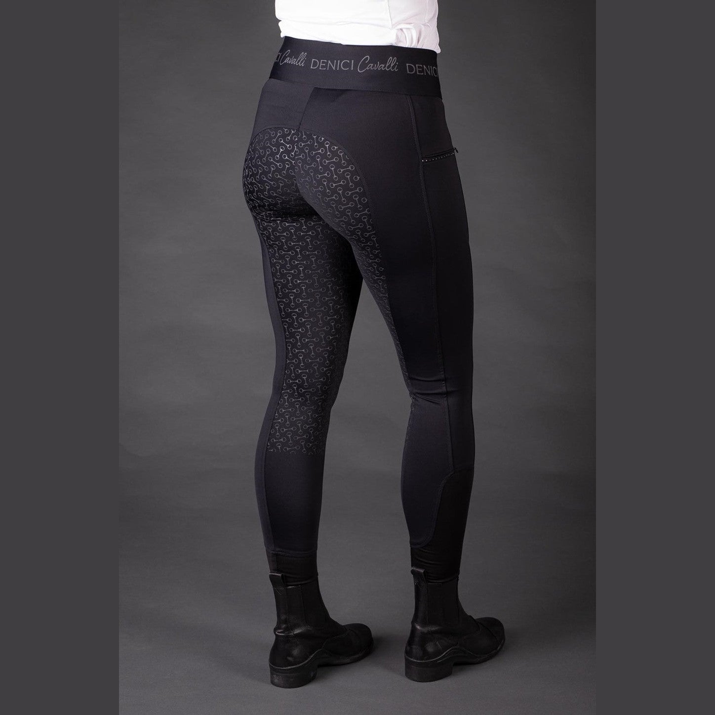 Paardrijlegging met twee zakken met ritssluiting, kristallen en een piping, een tone/tone Denici Cavalli print op de gehele tailleband, zitvlak voorzien van een siliconen print voor extra grip in het zadel en met een elastische inzet rond de enkels.