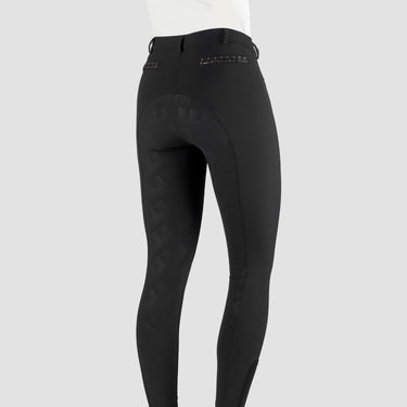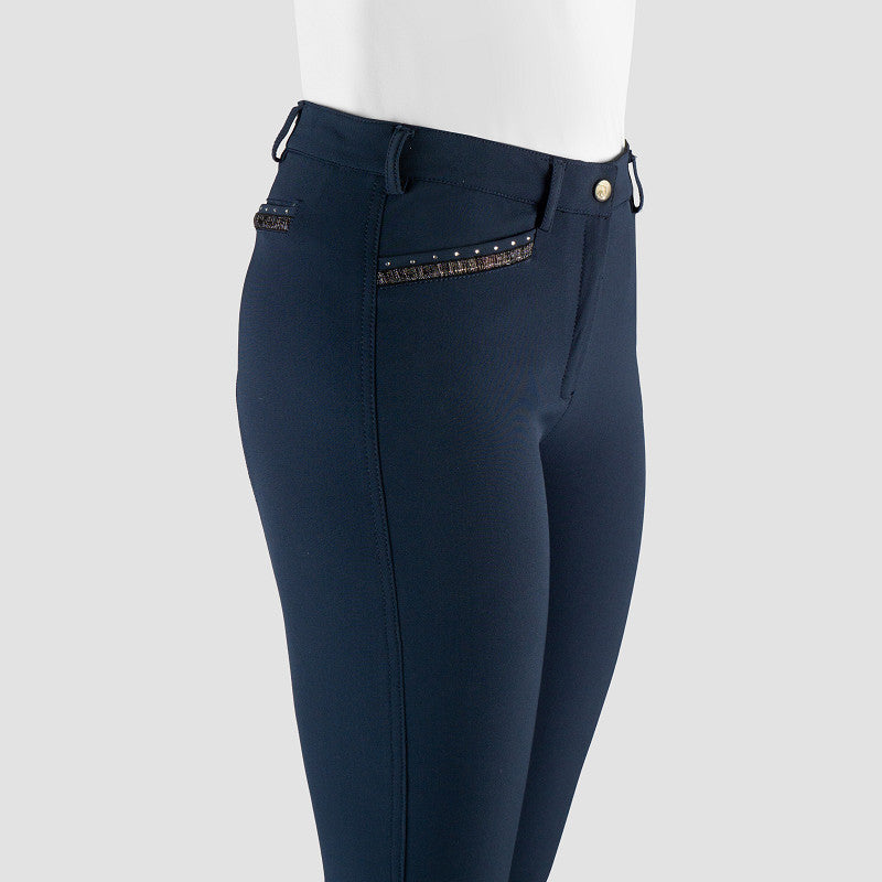 De Alexa is een damesrijbroek van comfortabel micropolyester. De broek heeft een flatterende pasvorm met een middelhoge tailleband. Subtiele glittertape en kristallen steentjes geven het een verfijnde uitstraling. De broek heeft twee voorzakken met ritssluiting diep genoeg om een mobiele telefoon op te bergen en twee nep achterzakken. Een matte siliconen zitvlak zorgt voor een goede grip in het zadel. De broek komt in 4 standaardkleuren met toevoeging van een nieuwe kleur bijpassend bij de meest recente seizoenscollectie. Productspecificaties: Stijlvol ontworpen dames rijbroek van comfortabel micropolyester Flatteuze pasvorm met middel hoge broekband Bling accenten door subtiele glittertape en kristallen steentjes Twee voorzakken met rits diep genoeg voor een mobiele telefoon en twee nep achterzakken Verkrijgbaar in 1 seizoenskleur en 4 standaard kleuren Matte silicone full seat Materiaal: 90% Micropolyester 10% Lycra geweven