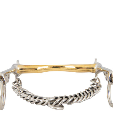 Deze kwalitatief hoogwaardige dressuurstang, met lichte tongvrijheid en vaste scharen, is vervaardigd van massief Cuprigan met roestvrijstalen scharen. Cuprigan is een legering bestaande uit 89% koper, 7% aluminium, 3% ijzer en 1% zink Het oxidatieproces van het materiaal geeft een prettige geur en smaak. De anatomische vormgeving volgt de vorm van de paardenmond, waardoor een zachte en gelijkmatige drukverdeling ontstaat. Door de combinatie van de vormgeving en de unieke samenstelling van Cuprigan, wordt het kauwproces en de speekselvorming gestimuleerd, waardoor er een fijne verbinding kan ontstaan met de gevoelige paardenmond. Het bit heeft een scherpe inwerking op de mond. Het mondstuk heeft een dikte van 14 mm en de scharen hebben een lengte van 140 mm. Inclusief kinketting.