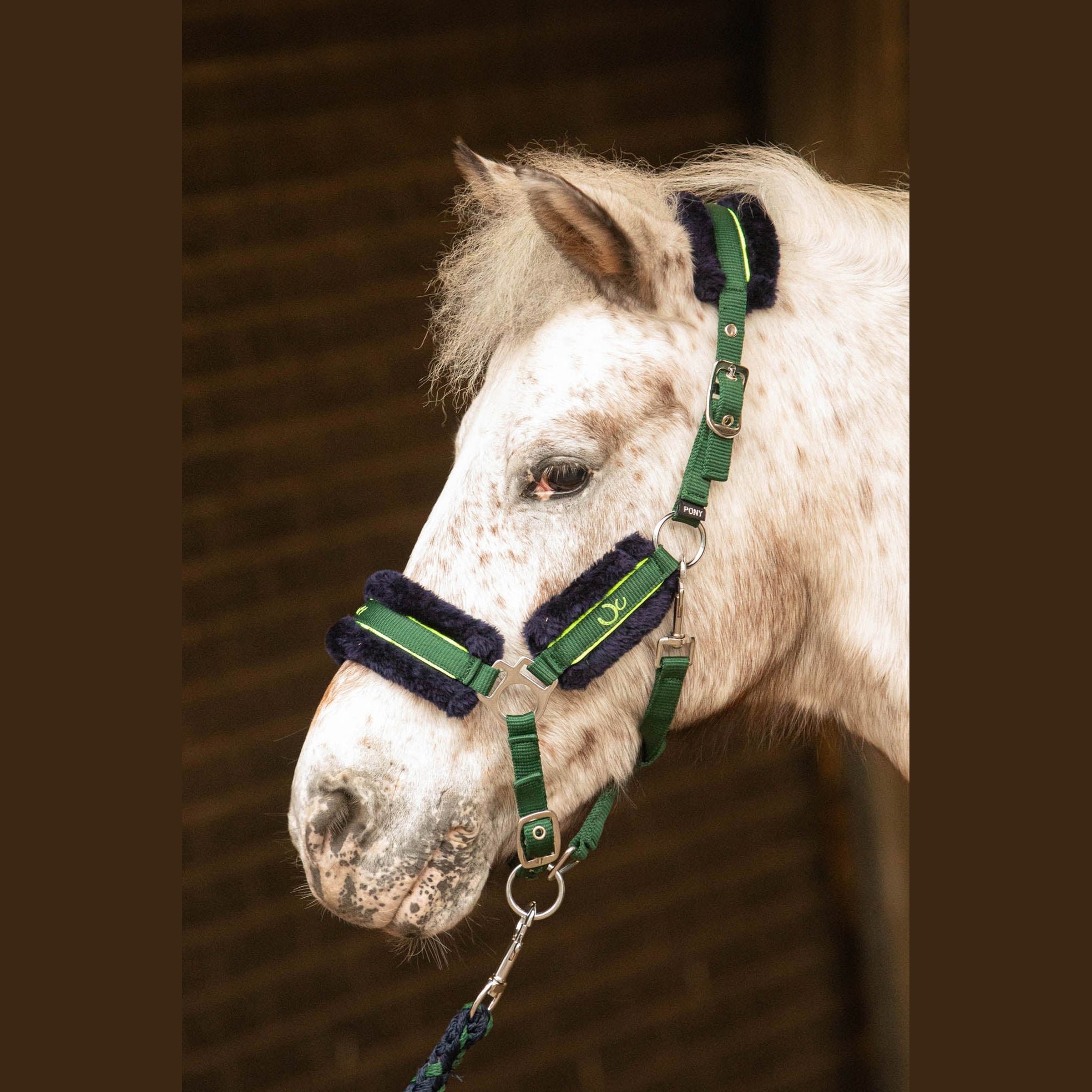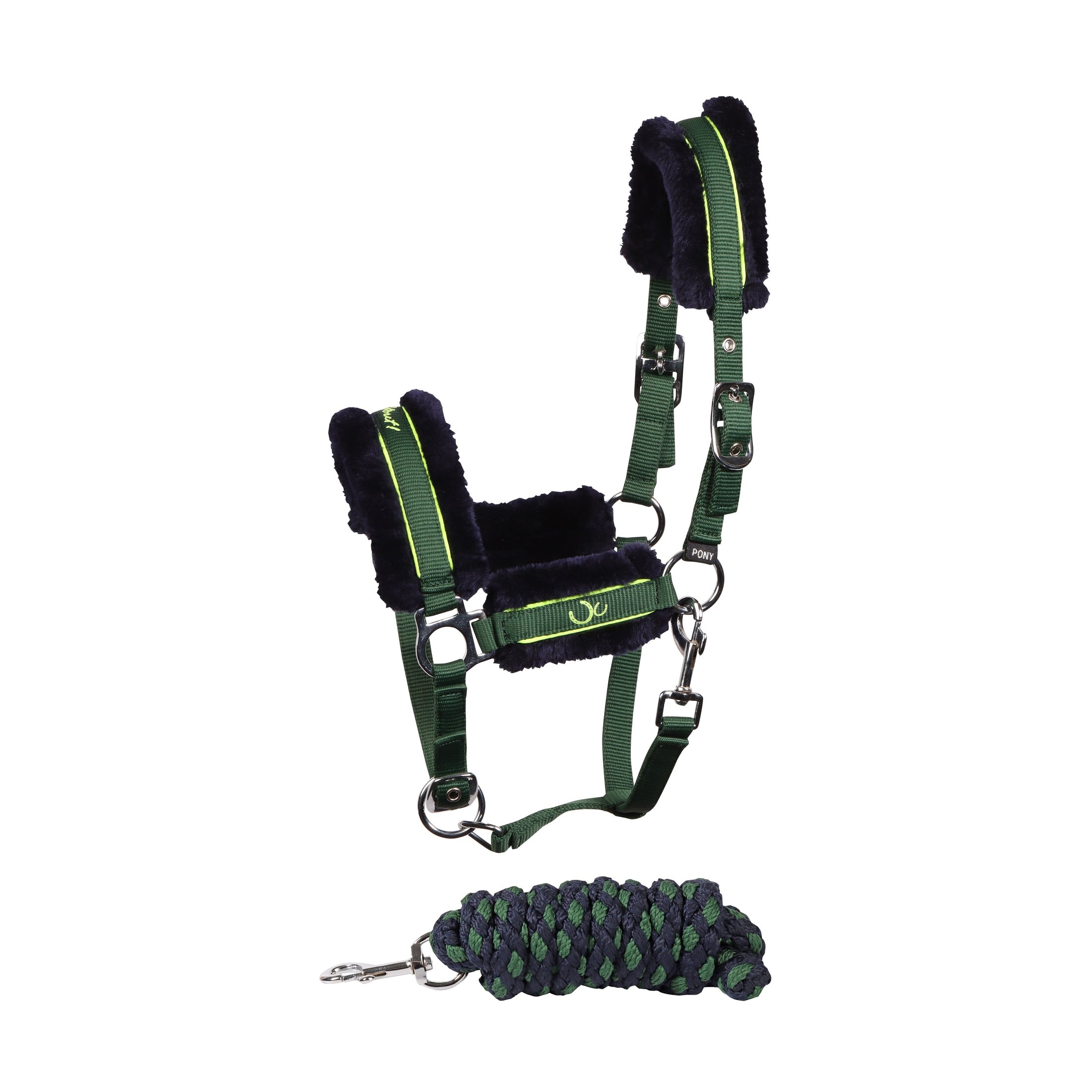 Halsterset met een zachte kunstbont polstering, contrasterende details. Dubbelzijdig verstelbaar aan het kopstuk en verstelbaar op de neus. Compleet met een halstertouw van 2 meter.