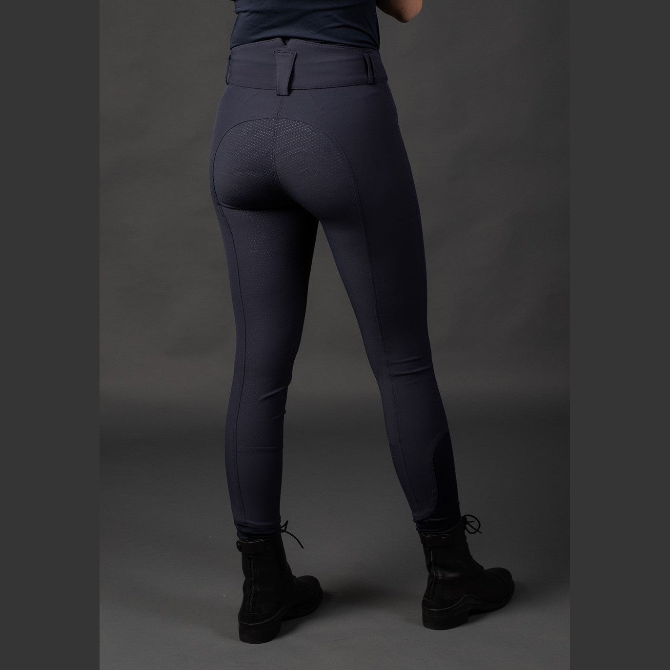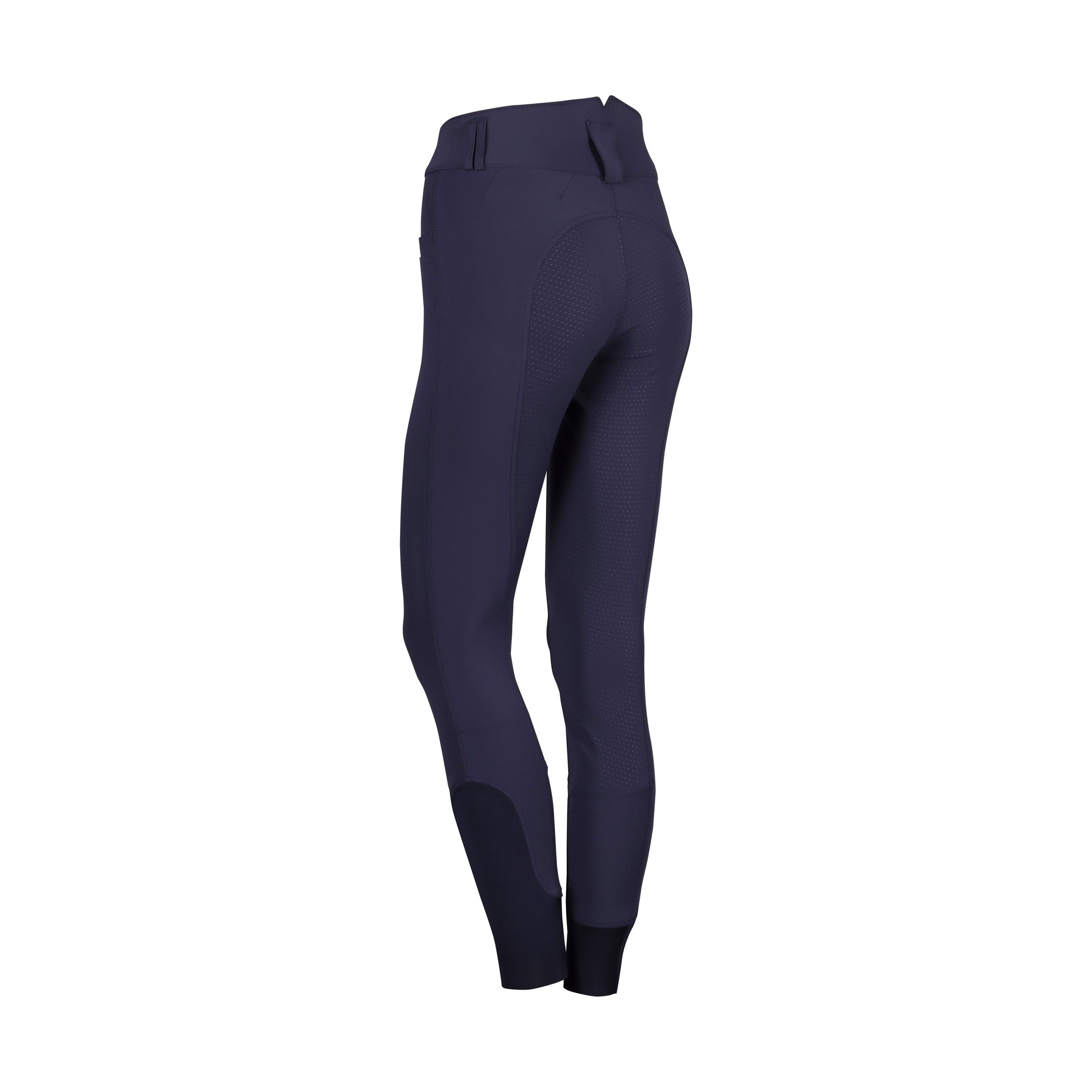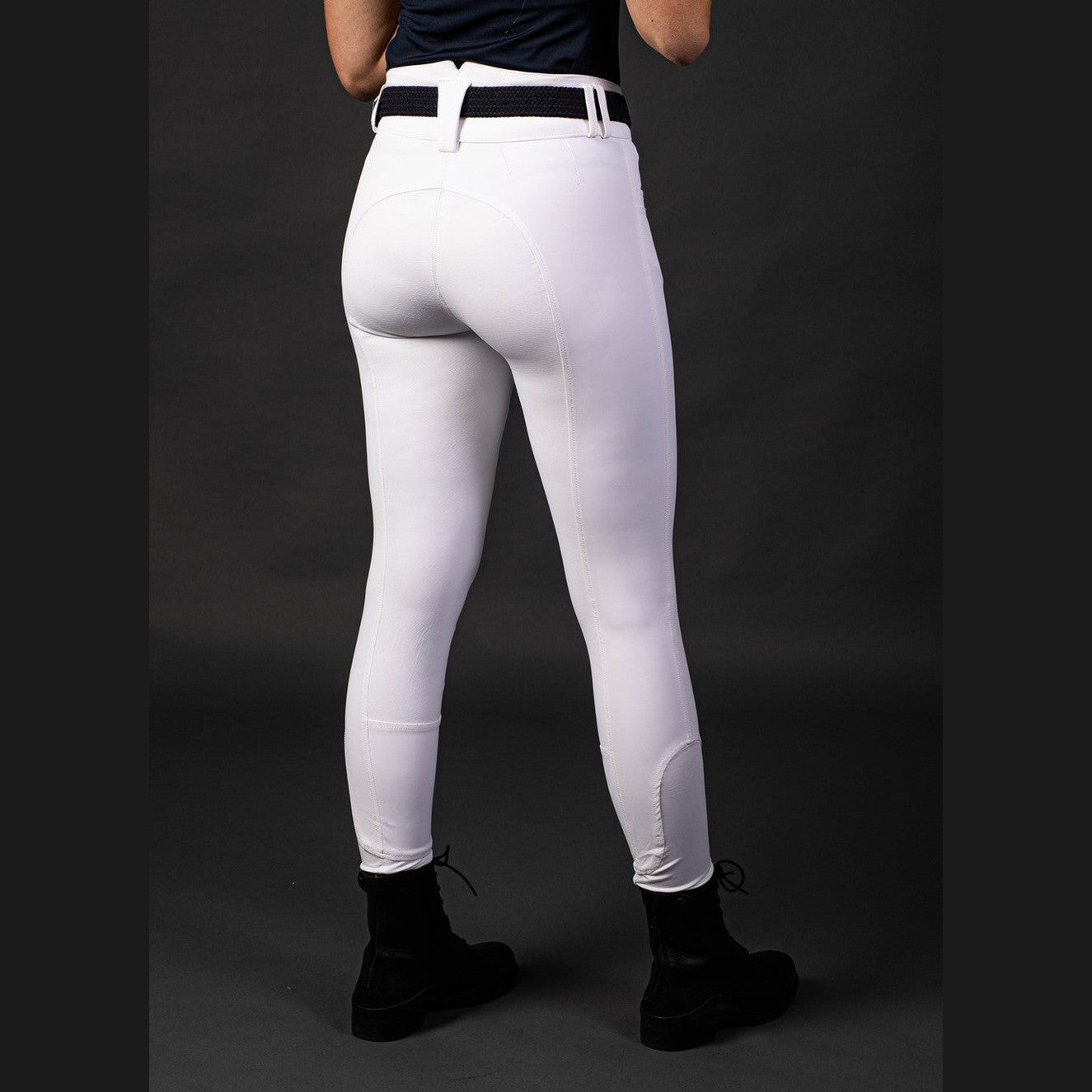 Reithose mit hohem Bund mit Gürtelschlaufen, zwei Seitentaschen, rundgenähtem Gesäß mit Silikondruck für zusätzlichen Halt im Sattel und „Flexlegs“ für zusätzlichen Komfort in den Reitstiefeln.