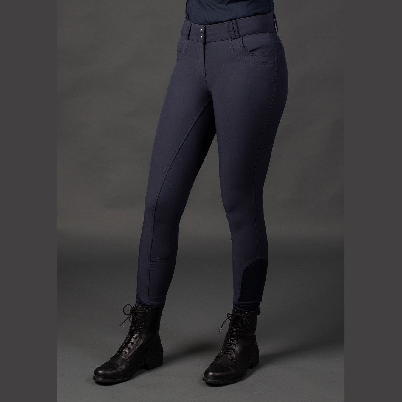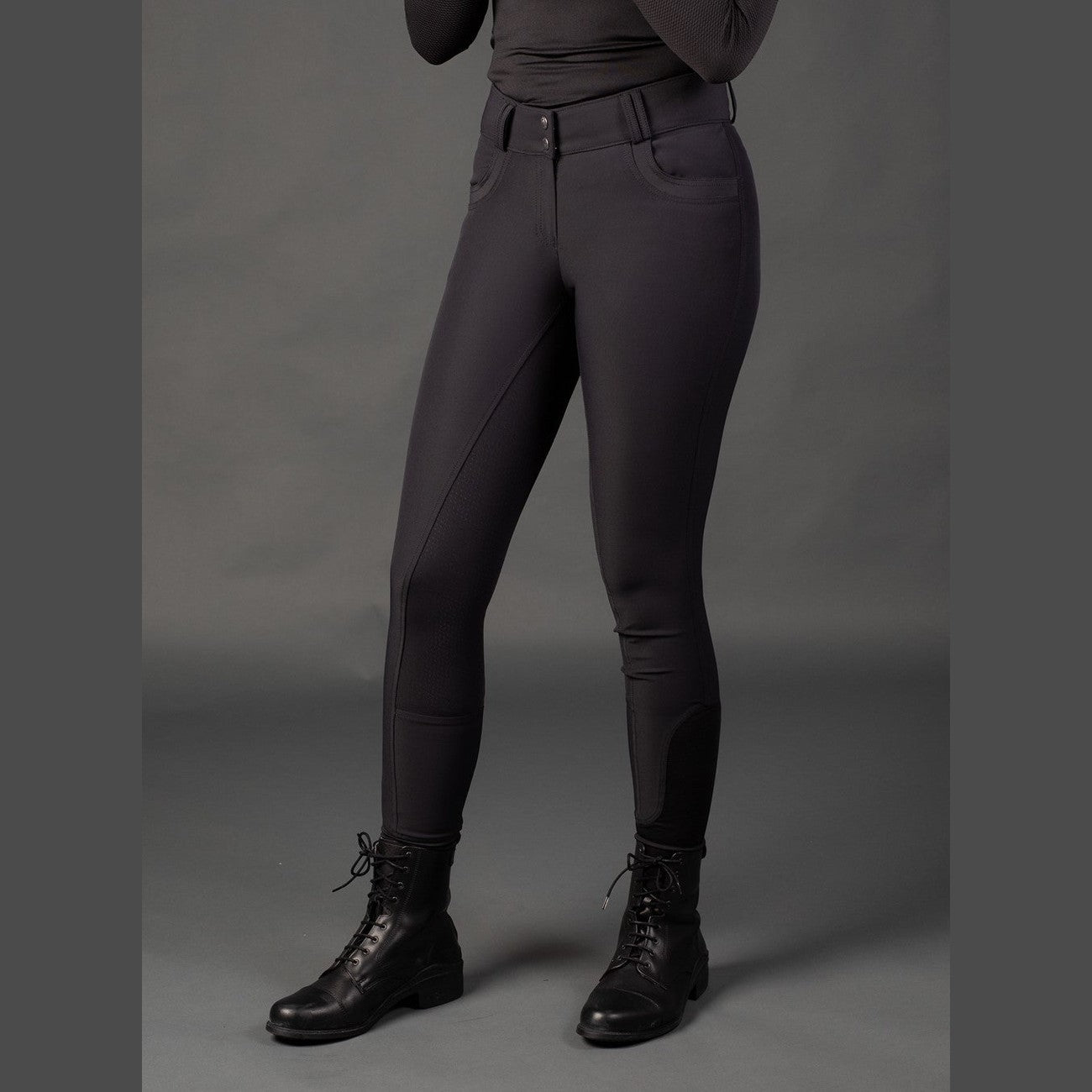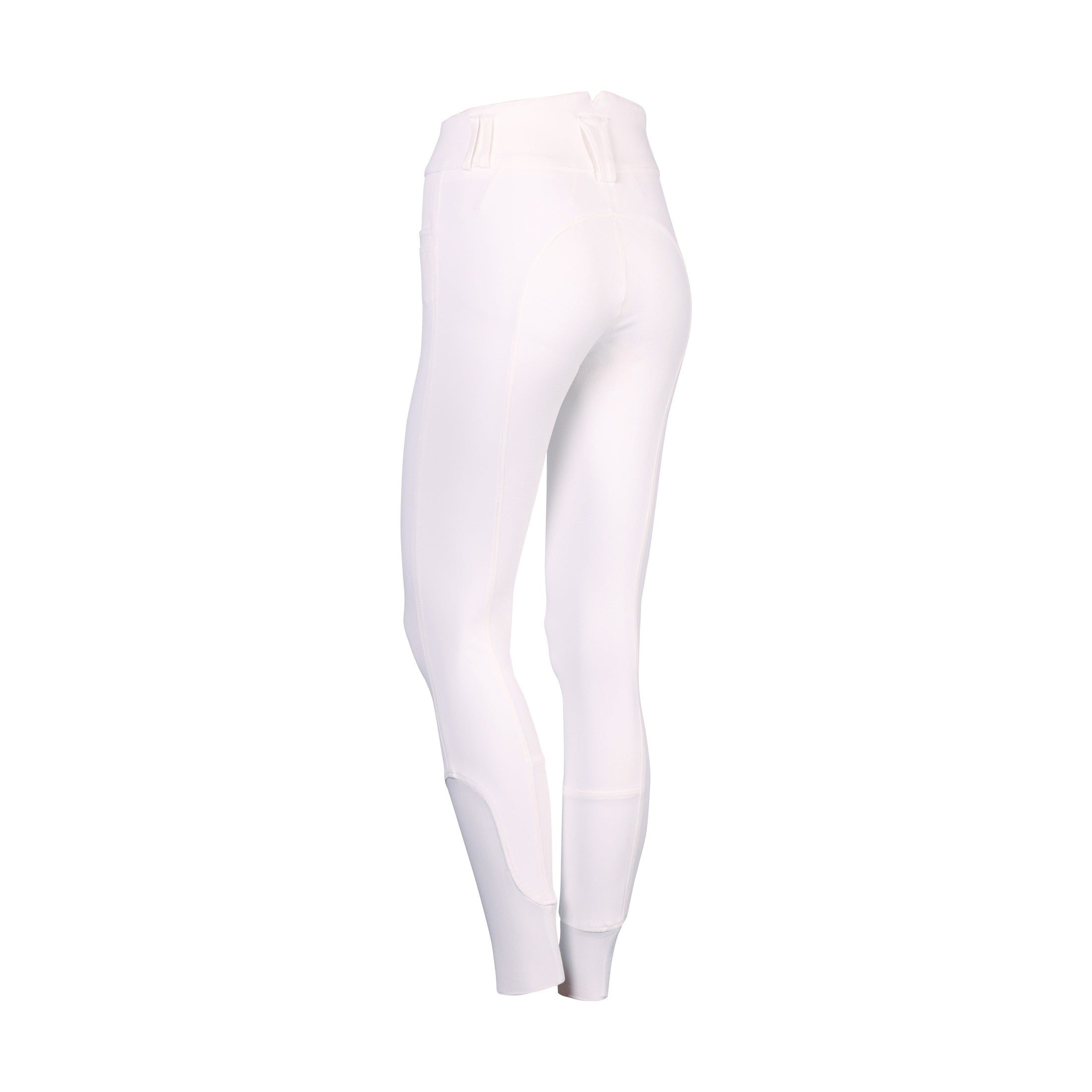 Reithose mit hohem Bund mit Gürtelschlaufen, zwei Seitentaschen, rundgenähtem Gesäß mit Silikondruck für zusätzlichen Halt im Sattel und „Flexlegs“ für zusätzlichen Komfort in den Reitstiefeln.
