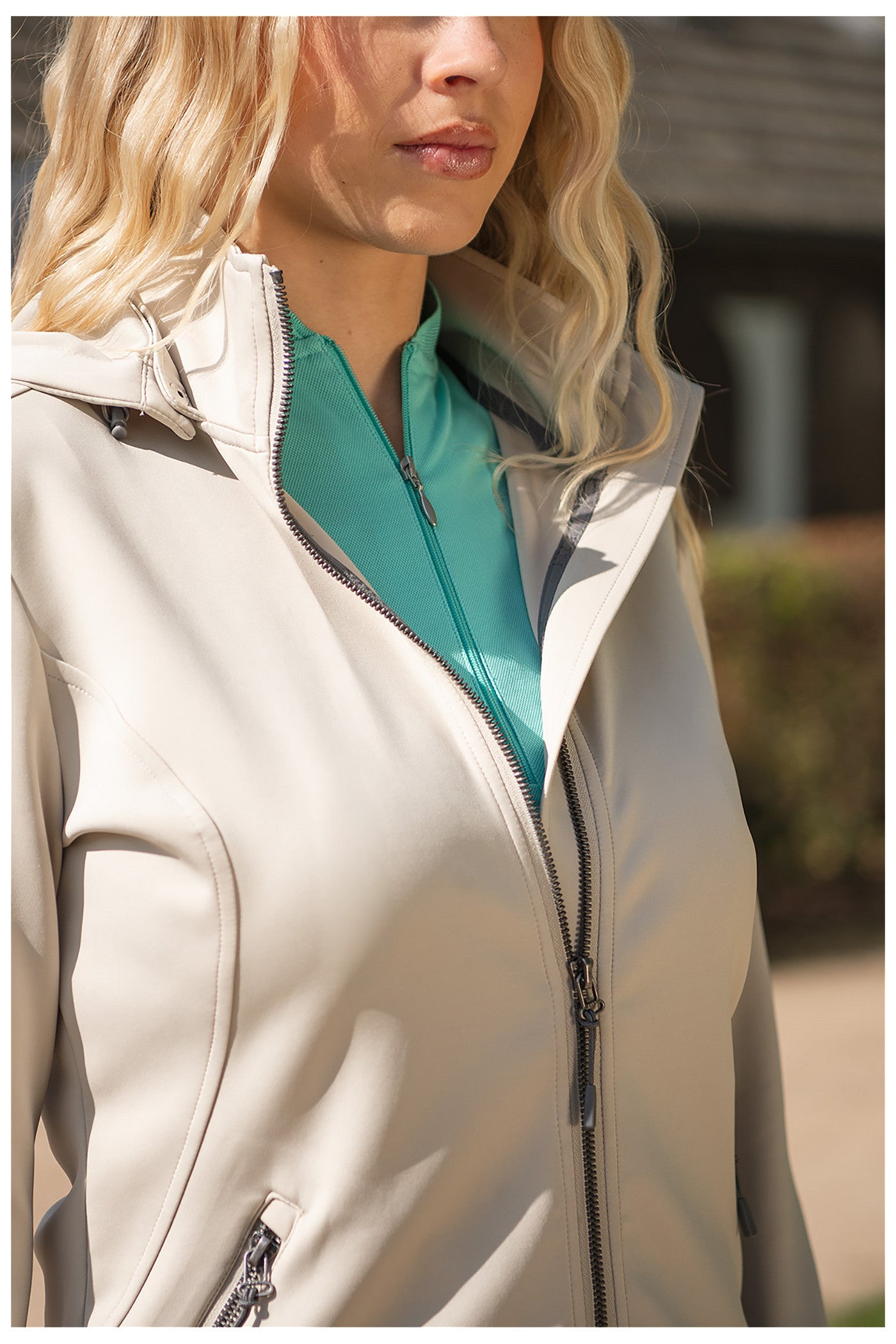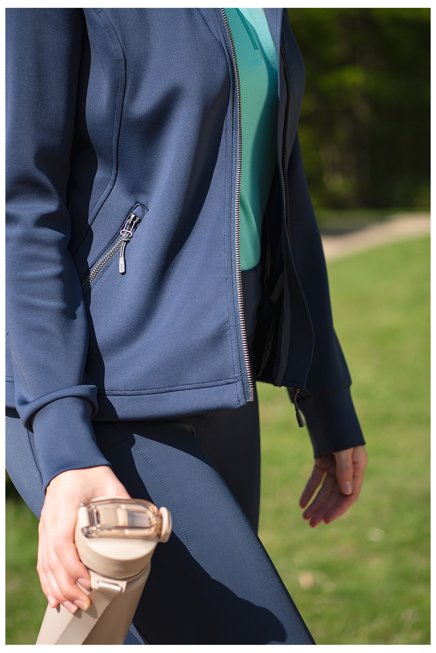 - Reißverschlüsse an Vorderseite und Taschen mit glänzend schwarzen Harzzähnen