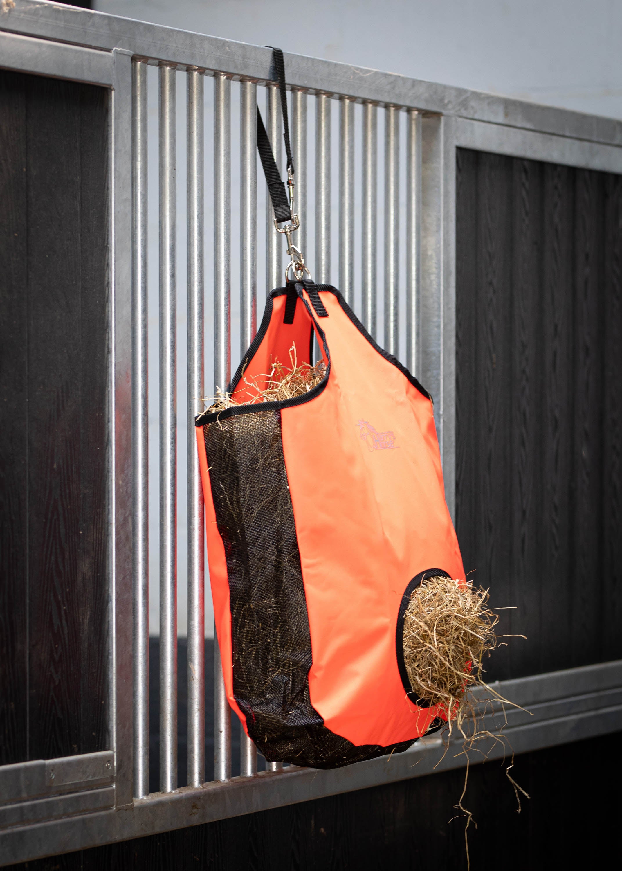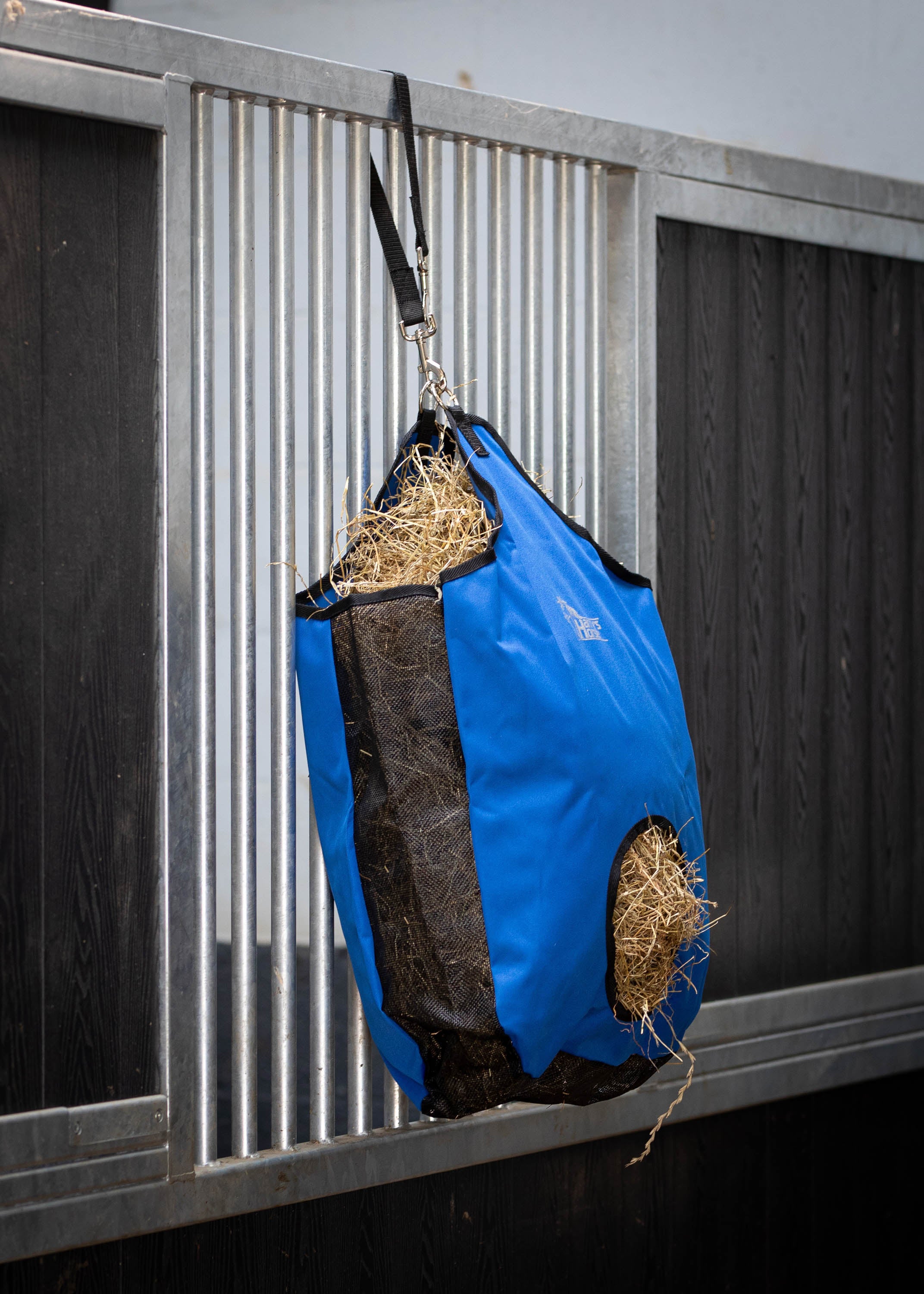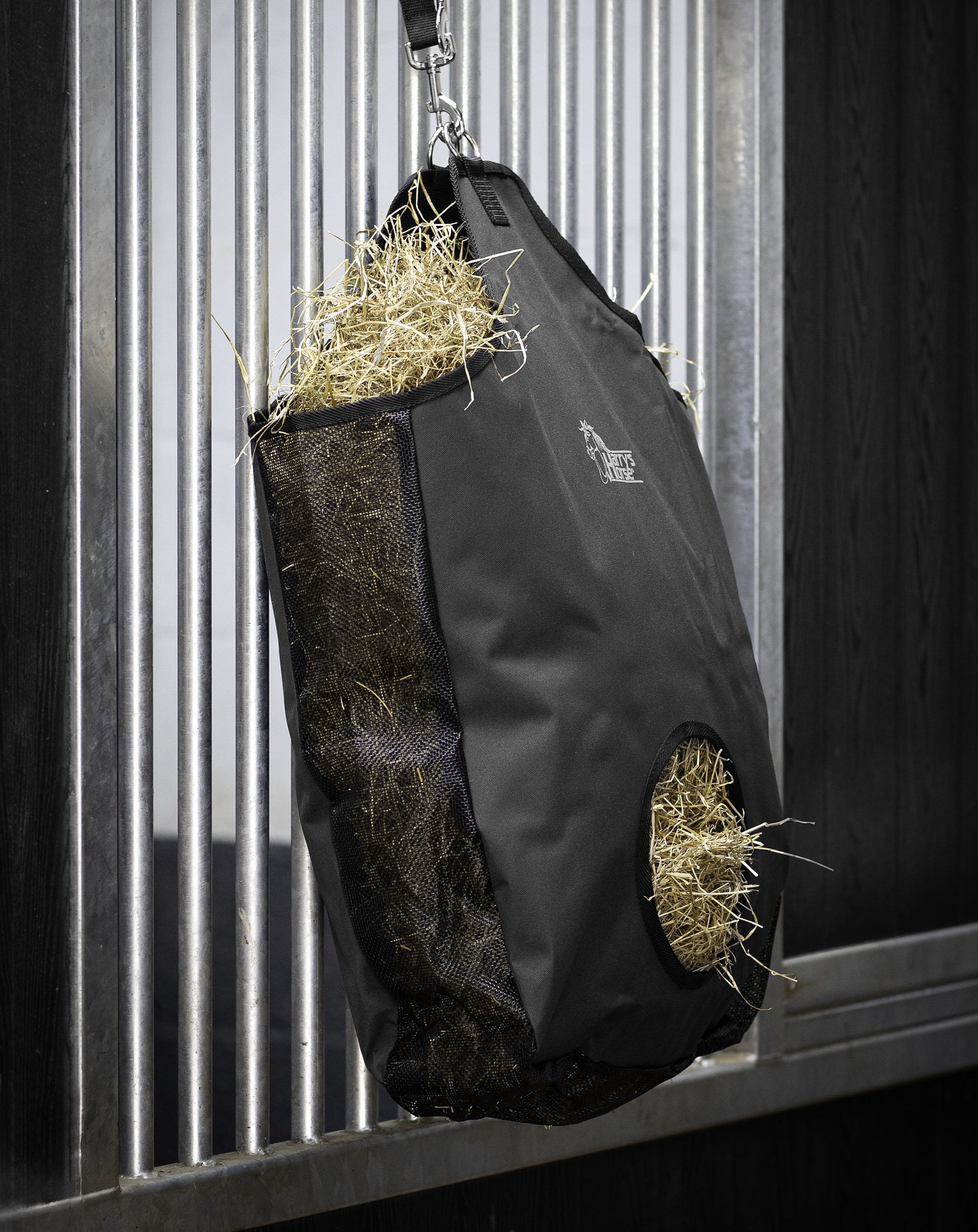 Sterke 600D nylon hooitas met gaas inzet aan de zijkanten en de bodem, waar het stof door heen valt. Hierdoor blijft de hooitas stofvrij! Belangrijk als het paard het laatste hooi uit de tas wil hebben, hij zijn neus niet in het stof hoeft te steken.