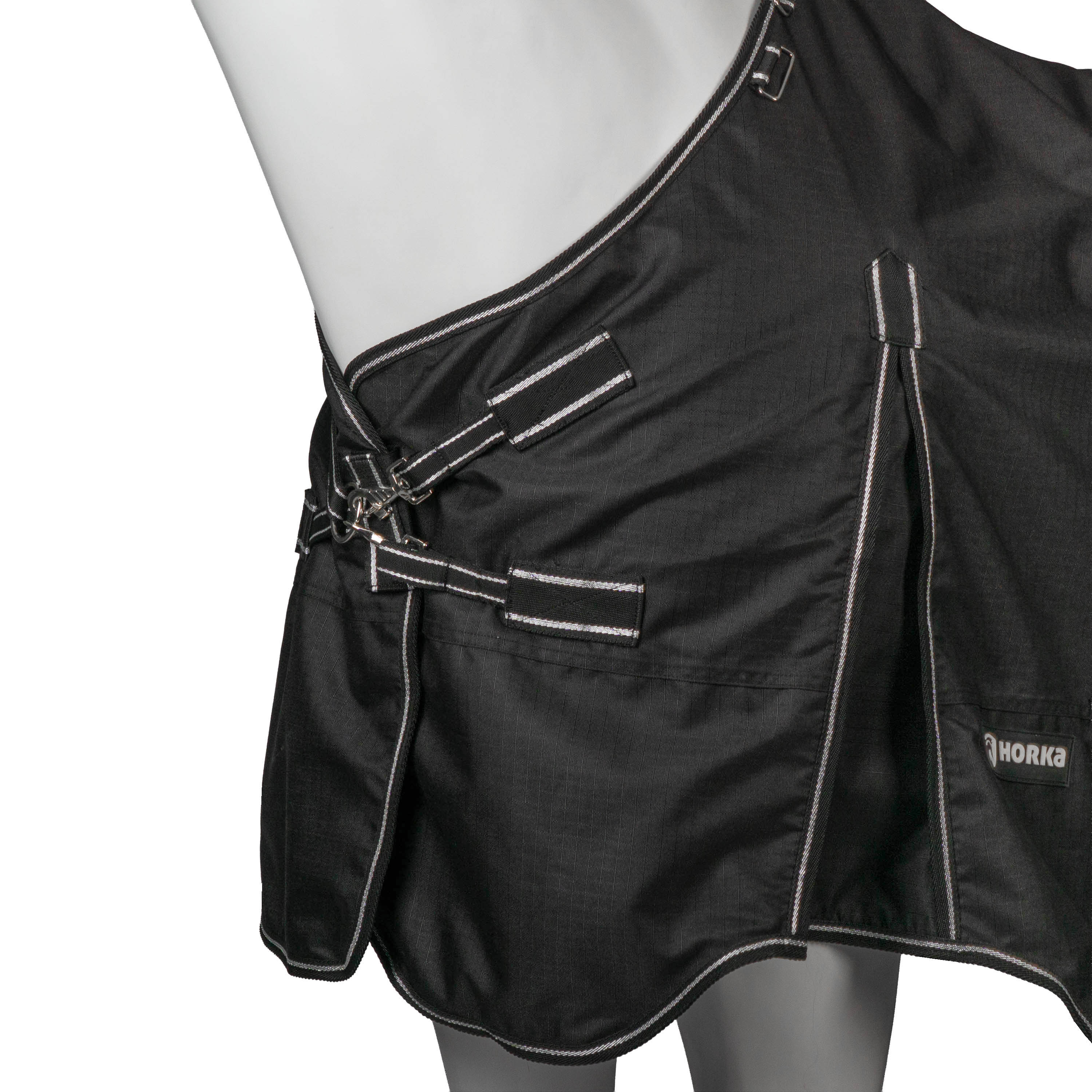 Turnout Rug Turi biedt een ideale combinatie van duurzaamheid en comfort dankzij de 600D ripstop waterdichte en ademende buitenstof en de zachte 50 GSM fleece voering. Het ontwerp met V halssluiting extra hoge loopsplitten en een met bont gevoerde schoft biedt optimale bewegingsvrijheid en bescherming. Met drie sluitingen een afneembaar staartkoord en bevestigingspunten voor een hals (niet inbegrepen) blijft de deken stevig op zijn plek en is hij geschikt voor diverse weersomstandigheden. Combineer met het halsdeel Dime (180337) voor volledige bescherming. Productspecificaties: < Turnout deken met fleece voering 600D ripstop buitenstof 3000 mm waterdicht en 3000 mvp ademend 50 GSM fleece voering V hals/sluiting 3 sluitingen Afneembaar PVC omhuld staartkoord en brede staartflap Extra lange en brede loopsplitten bont gevoerde schoft 3 bevestigingspunten voor een hals (hals niet inbegrepen te combineren met hals Dime 180337) Materiaal:< Polyester 600D polyfleece voering