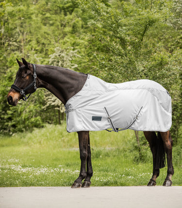 Hoogwaardige vliegendeken van fijnmazig materiaal met kruissingels en een waterafstotende ruginzet. Met triplex voorsluiting, staartkoord en ringen voor het bevestigen van de halslijn.