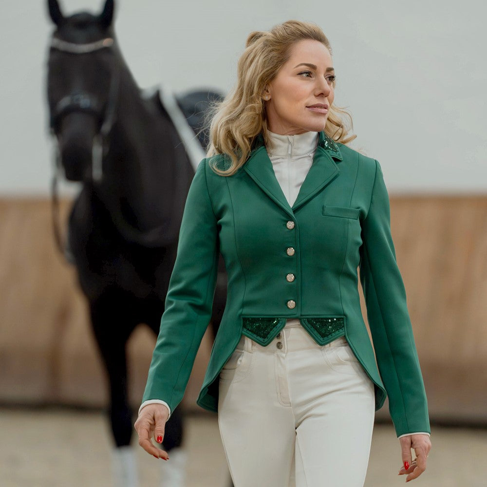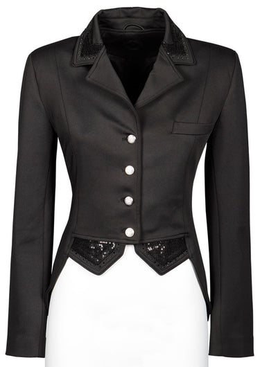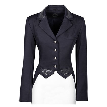 Luxe wedstrijdjasje van hoogwaardig stretch materiaal. Het jasje is uitgevoerd met een crystal knoopsluiting met daaronder een ritssluiting voor perfecte pasvorm, kraag en giletflapjes zijn voorzien van tone/tone pailetten/crystallen en een piping. Sierlijke knopen.