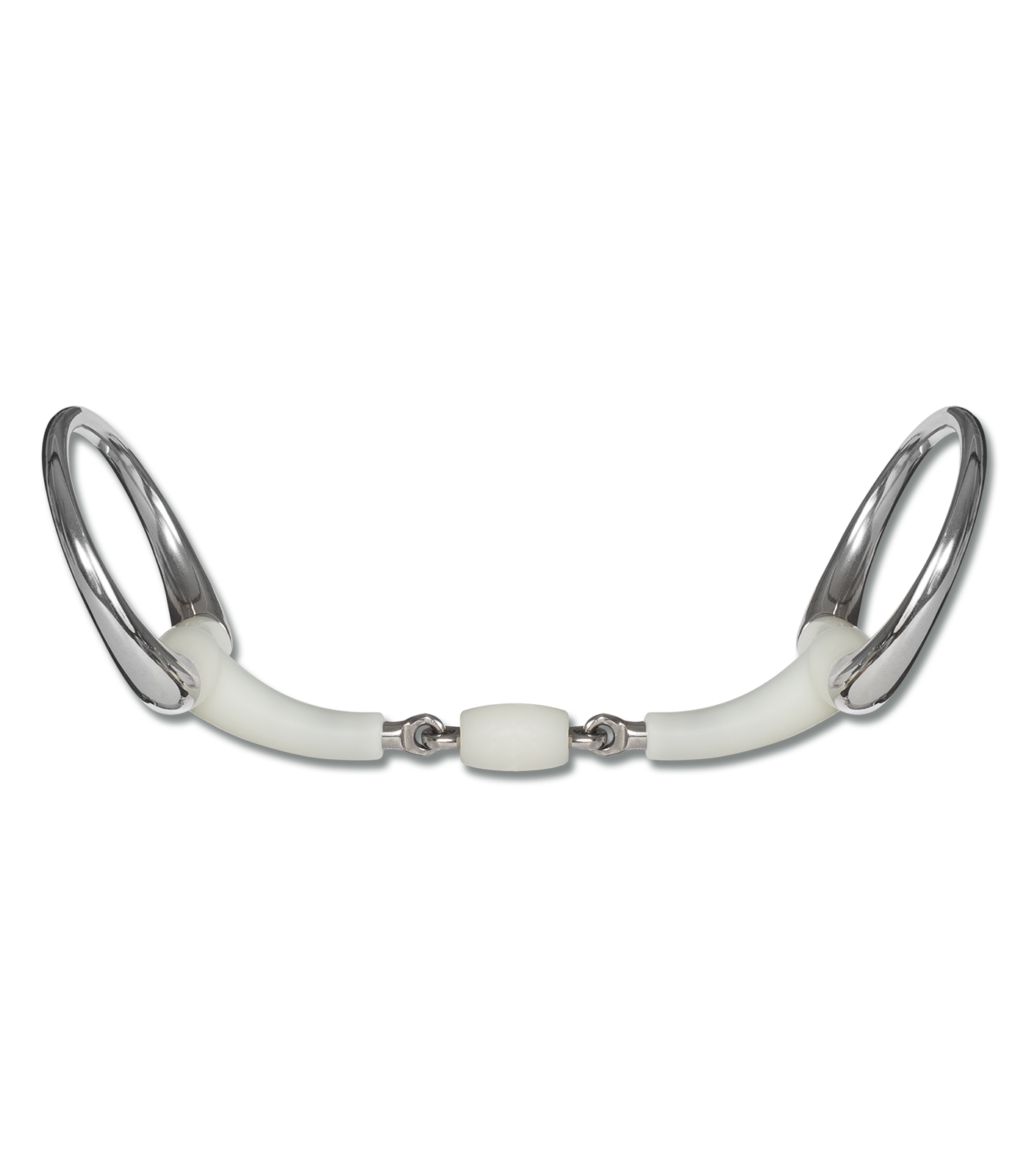 De zachte werking van het ergonomisch gevormde, dubbel gebroken mondstuk in combinatie met een rol als centraal onderdeel bevordert de acceptatie van het bit en het welzijn van het paard. Gemaakt van mondvriendelijk kunststof, met appelsmaak.