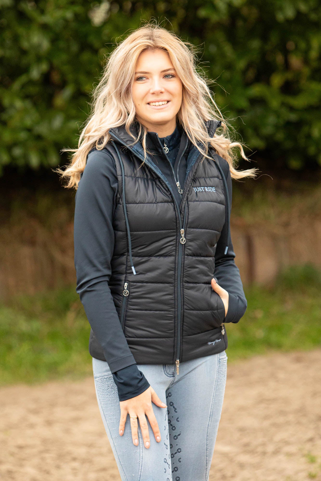 Sportieve en gevoerde bodywarmer met een capuchon met een trekkoord. De bodywarmer heeft verder een tweeweg ritssluiting, twee steekzakken met ritssluiting en de voering heeft een alloverprint.