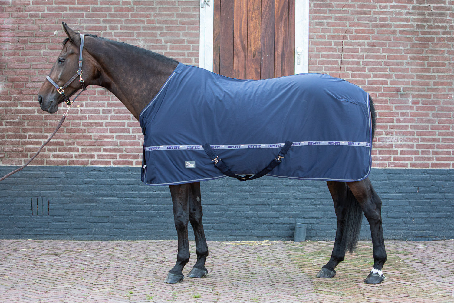 De Dry-Fit deken is een fijne, soepele deken met fleece aan de binnenkant, waardoor het draagcomfort heel fijn is voor het paard en het zweet makkelijk wordt weggevoerd van het lichaam van het paard. Het is een hele lichte deken waardoor de bewegingsvrijheid groter is.