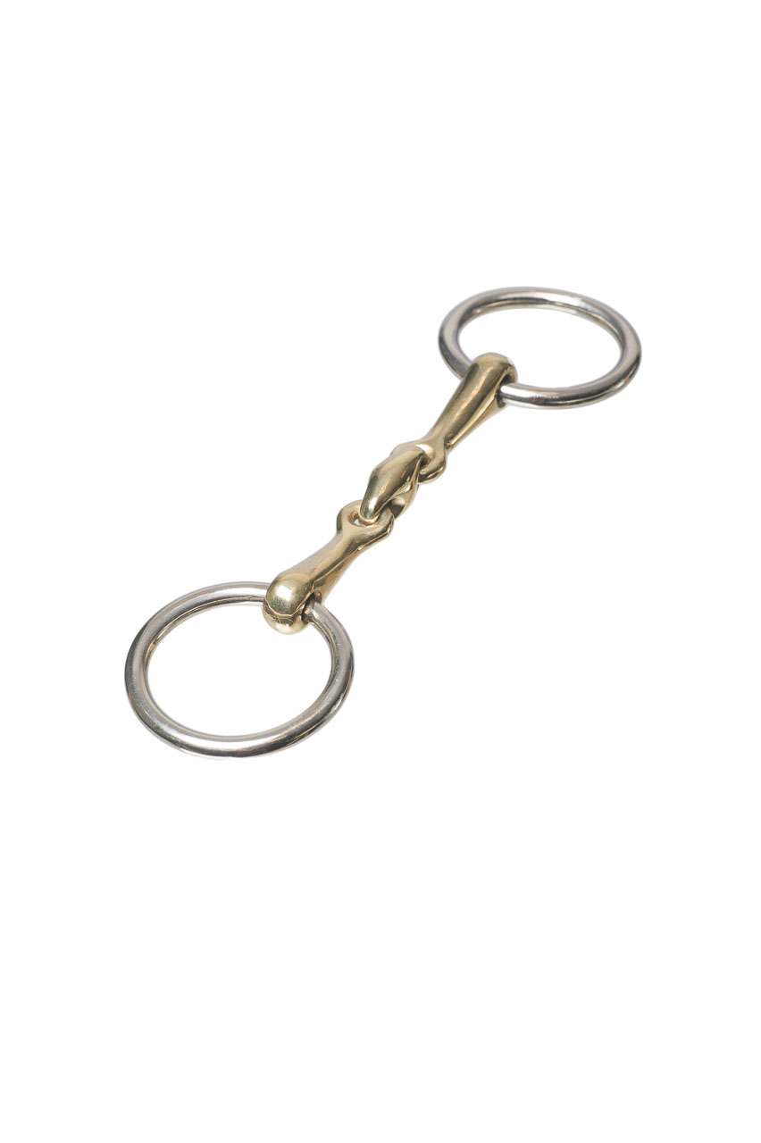 Bij een dubbel gebroken bit bestaat het mondstuk uit drie delen. Het middelste gedeelte van het mondstuk ligt plat op de tong. Hierdoor ontstaat er meer druk op de tong dan bij een enkel gebroken mondstuk. Hoe dikker het middenstuk, des te meer druk op de tong. Dit model is mooi smal gevormd en daardoor uitermate geschikt voor de kleine ponymond. De ringen hebben een doorsnede van 4.5 centimeter.