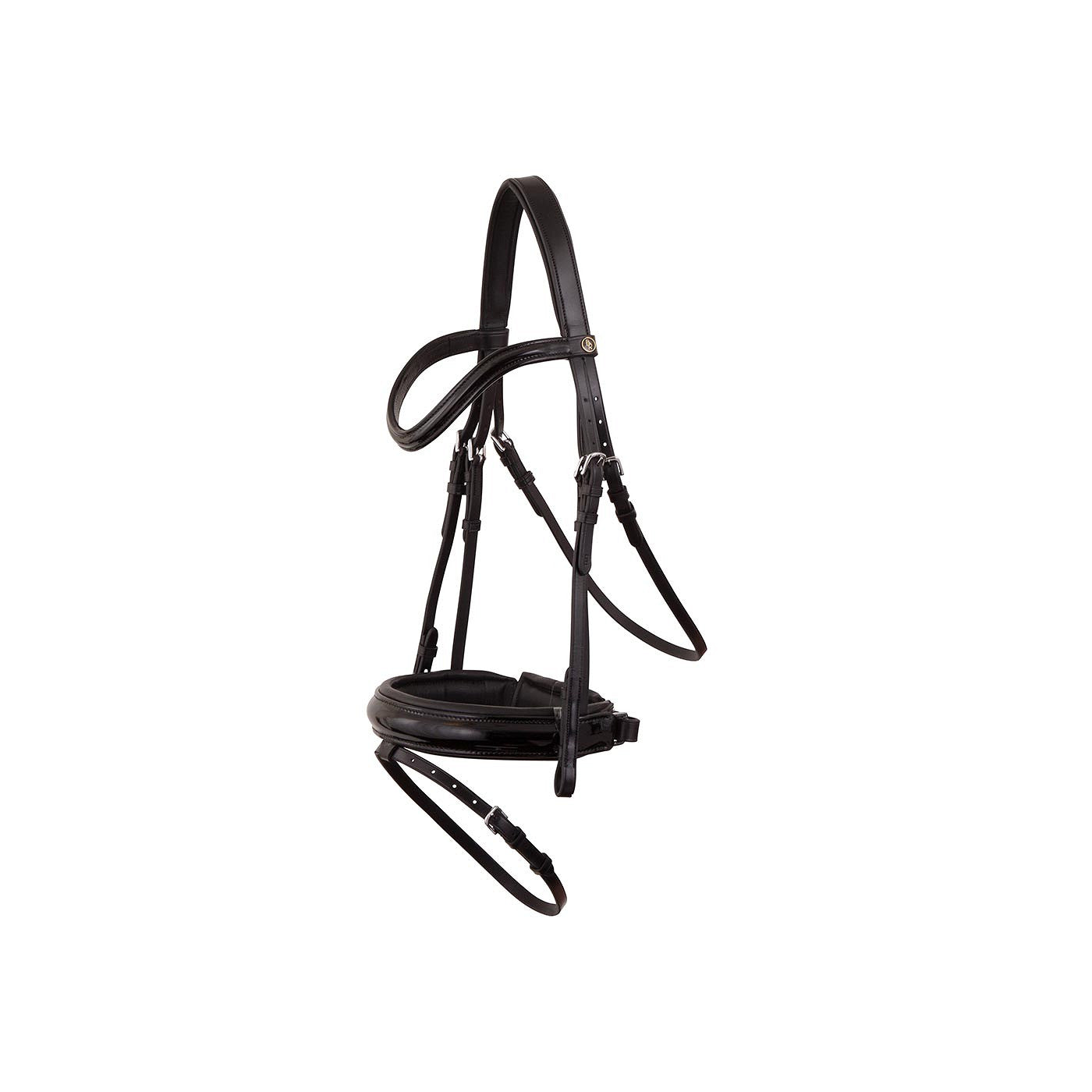 Symmetrisch hoofdstel met zacht gevoerd kopstuk. Het gebogen, laklederen frondeel is rond gebombeerd en met zacht leder onderlegd. De extra brede, gecombineerde aansnoerneusriem (circa 4.5 cm) met lakleder is rond gebombeerd, zacht gevoerd en voorzien van een brede, zacht gevoerde kaakbeschermer. Het hoofdstel is voorzien van een V-vormige sperriemlus, blinde sluitingen en ronde, glanzende, zilverkleurige fournituren. Exclusief teugel.