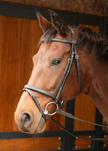 Kunstlederen hoofdstel met gecombineerde neusriem. Vanwege het kunststof materiaal bijzonder makkelijk in onderhoud. Het kopstuk en de neusriem zijn voorzien van zachte kunstleder padding, lusjes en andere details zijn tevens van kunstleder.