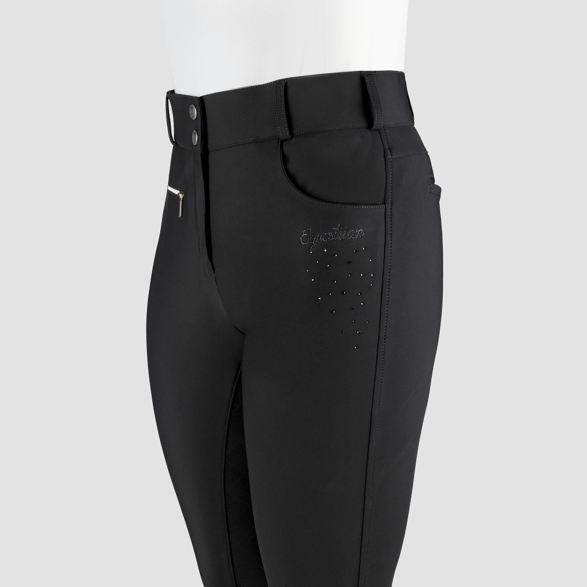 Exclusieve damesrijbroek Kiana is gemaakt van een zeer hoogwaardige technische stof. De broek heeft een siliconen zitvlak voor extra grip in het zadel. Productspecificaties: Waterafstotende vochtafvoerende en ademende stof met UV bescherming Glitter borduur details Twee voorzakken riemlussen en 2 V vormige achterzakken Voorzakken zijn diep genoeg zijn voor een mobiele telefoon Matte siliconen zitvlak Materiaal: Buitenkant: 82% Nylon 18% Spandex. Binnenkant: 90% Polyester 10% Spandex Let op! De maten in de huidige voorraad vallen ruim daarom raden wij aan om een maat kleiner te bestellen.