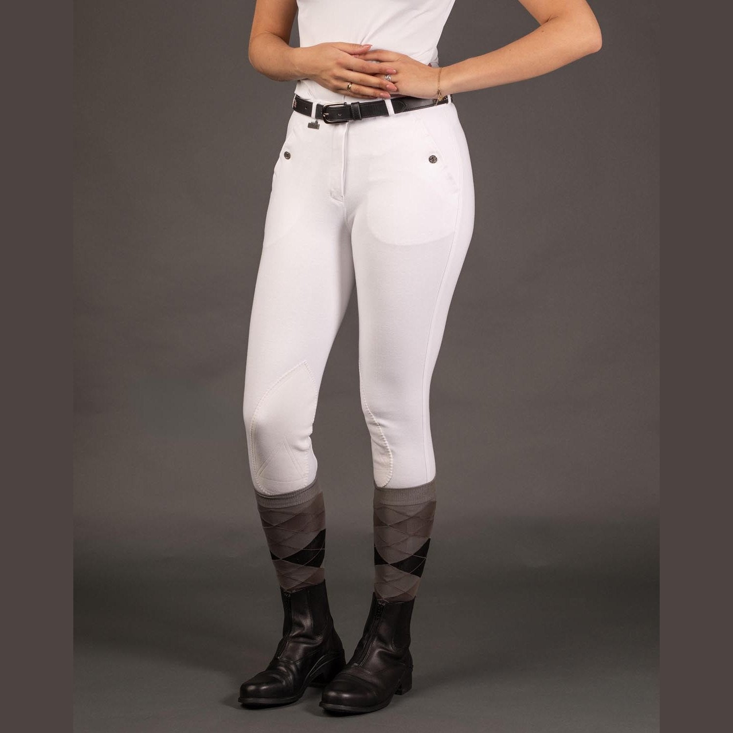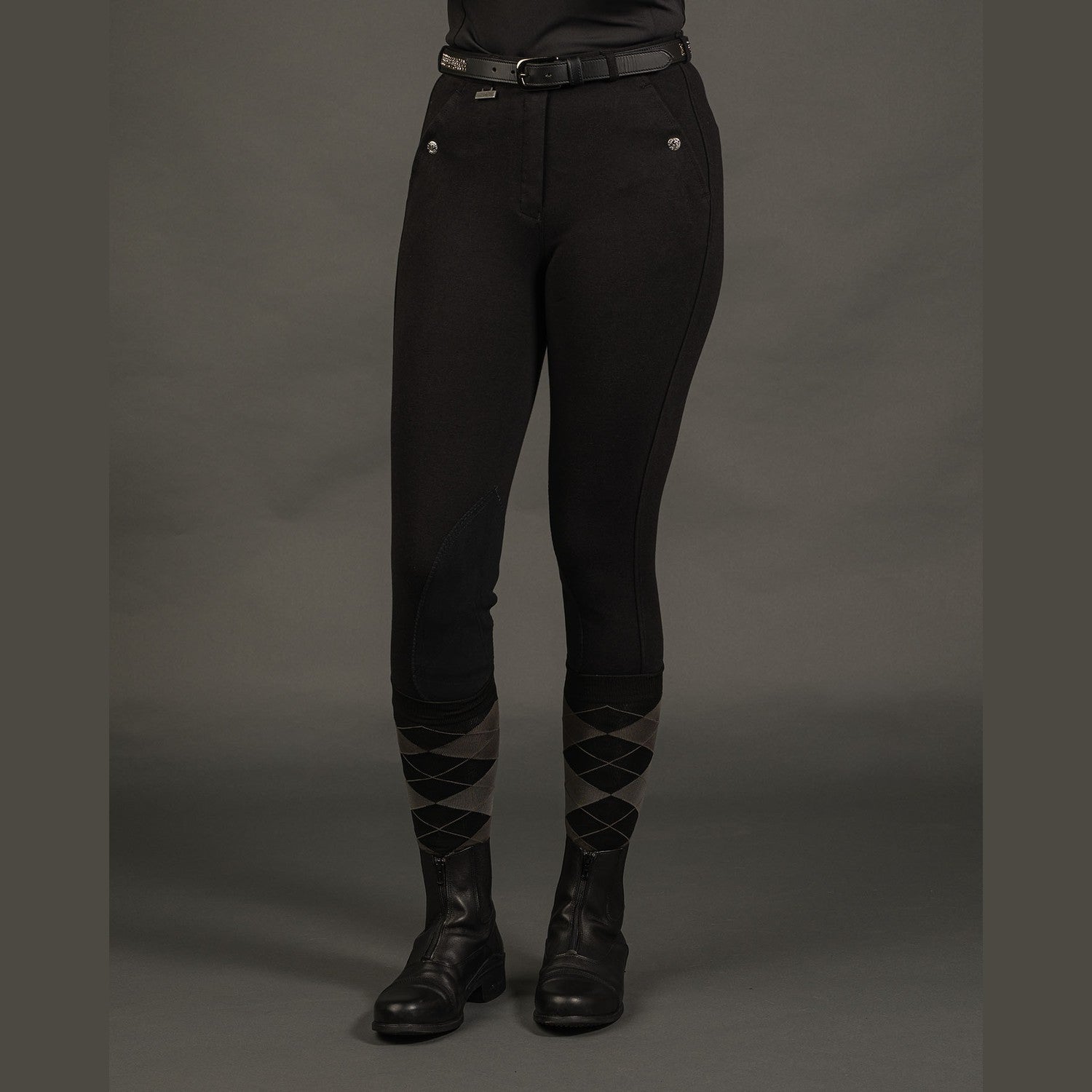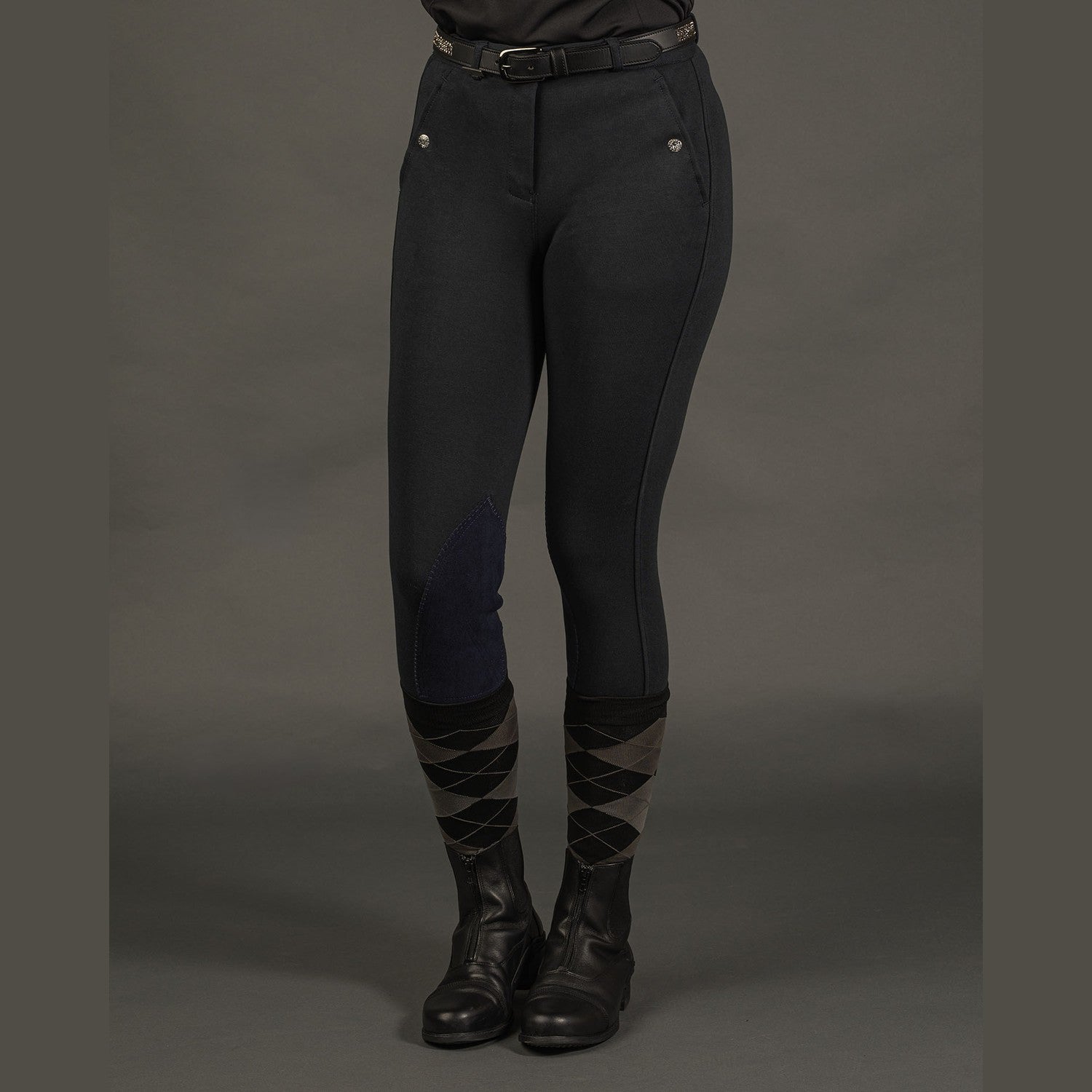 Rijbroek met steekzakken met drukknoopsluiting, schuifgesp sluiting en rits, riemlussen, elastische kunstlederen kniestukken en elastische inzet onderaan de broekspijp.