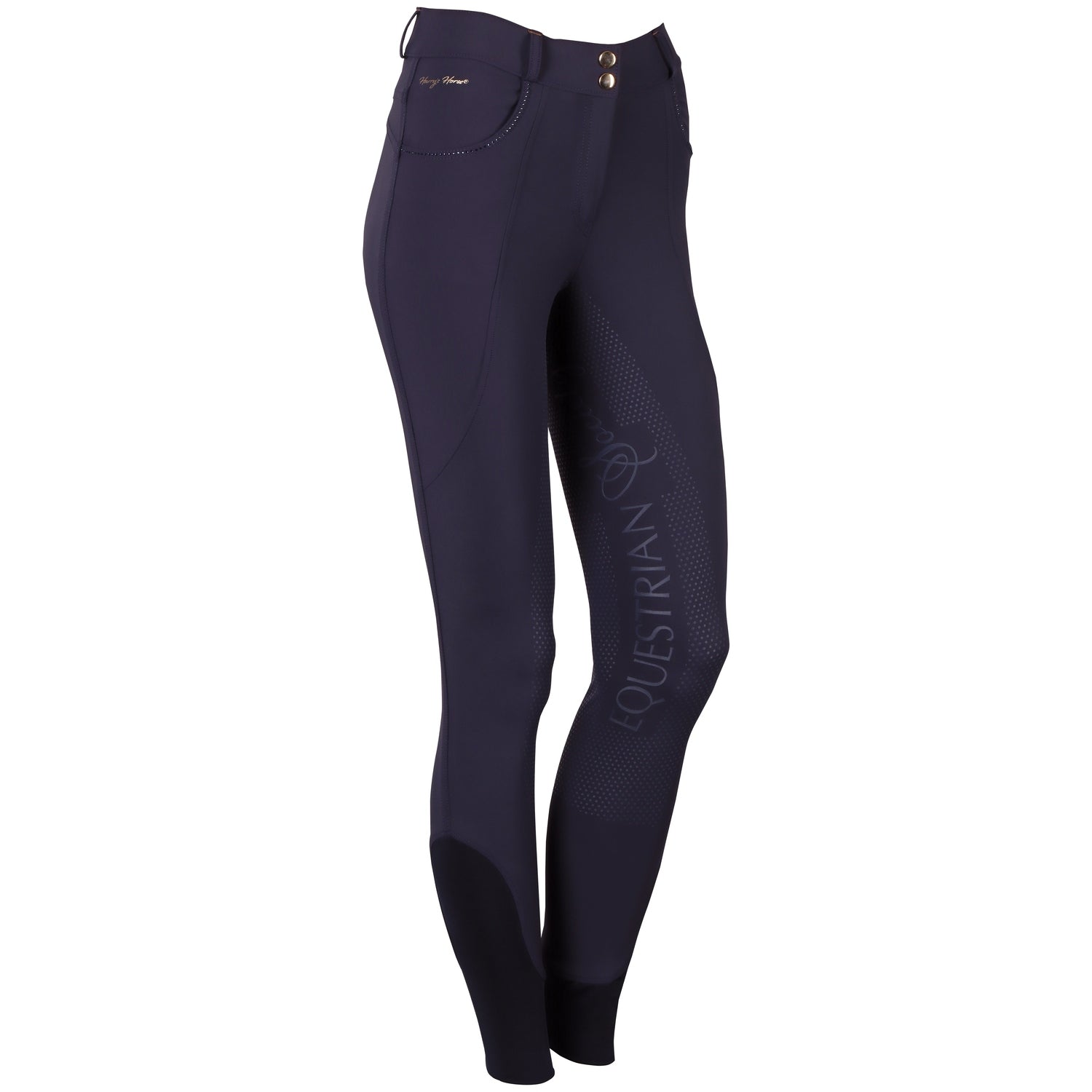 Paardrijbroek met twee steekzakken met kristallen details, riemlussen op de tailleband met glimmende details, rondgenaaid zitvlak voorzien van een siliconen print met Equestrian Society erin verwerkt en een comfortabele elastische inzet rond de enkels.