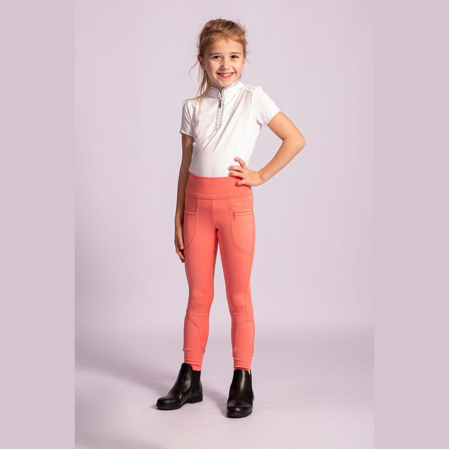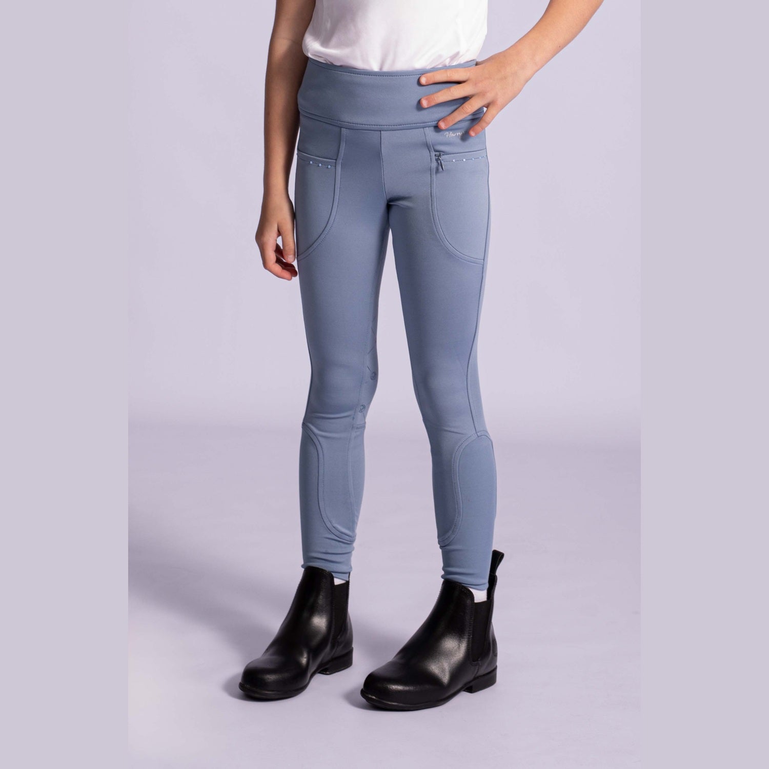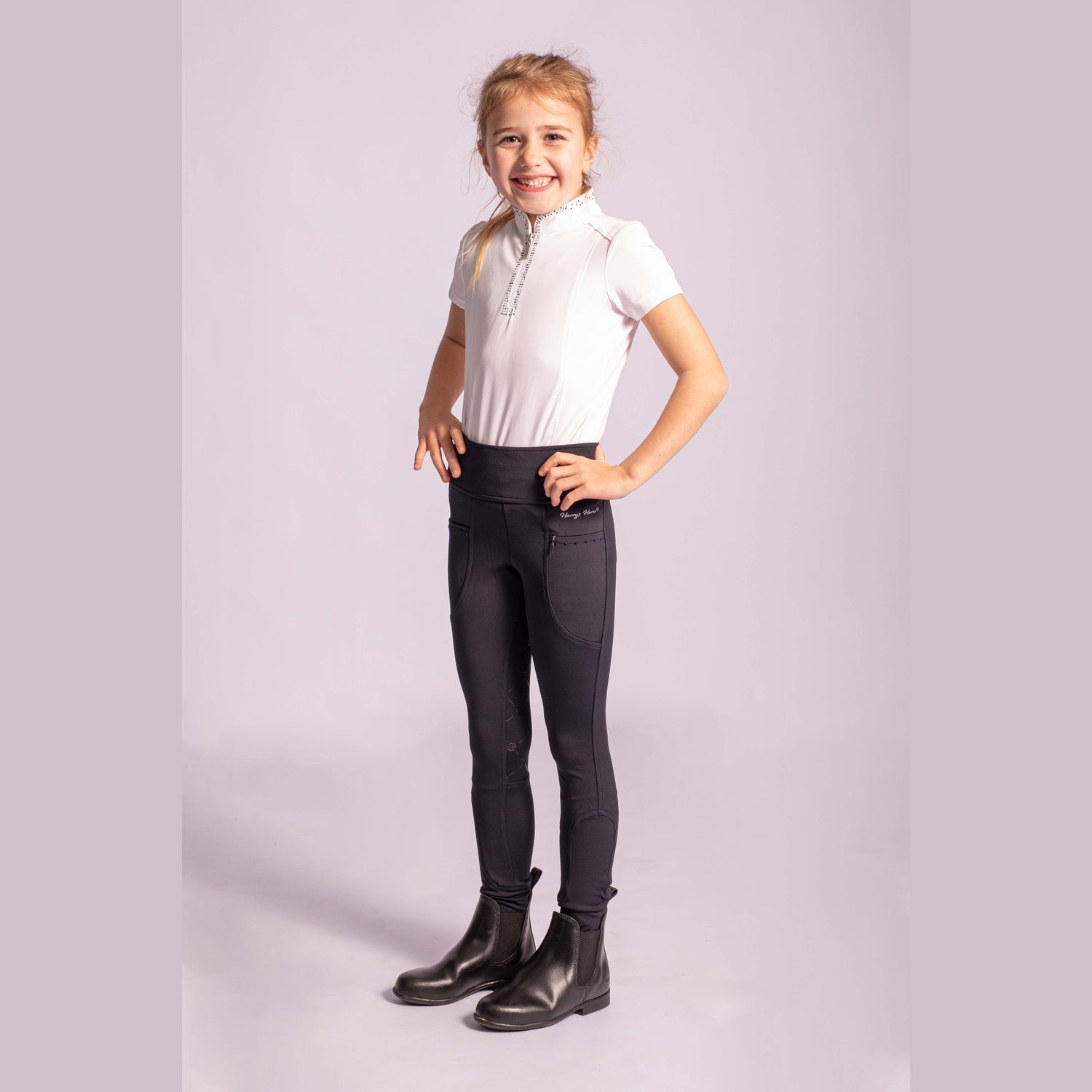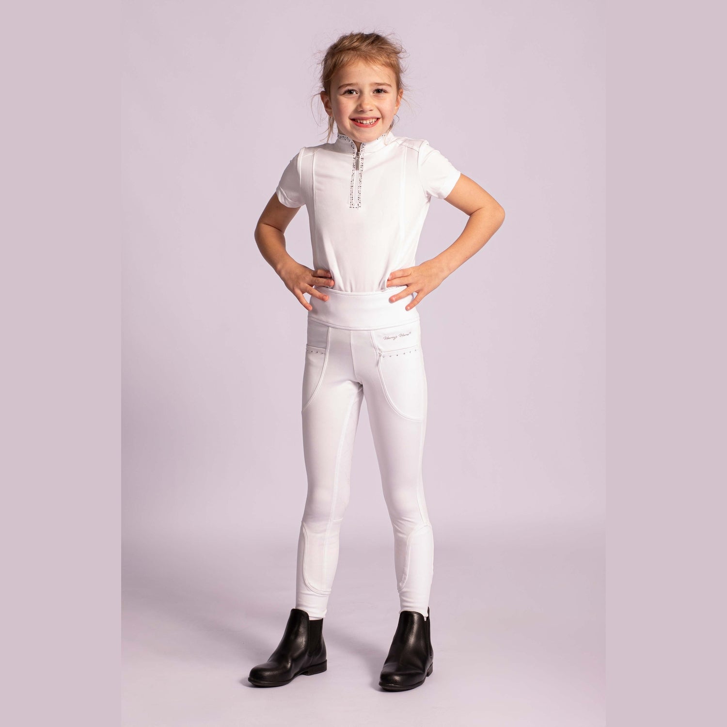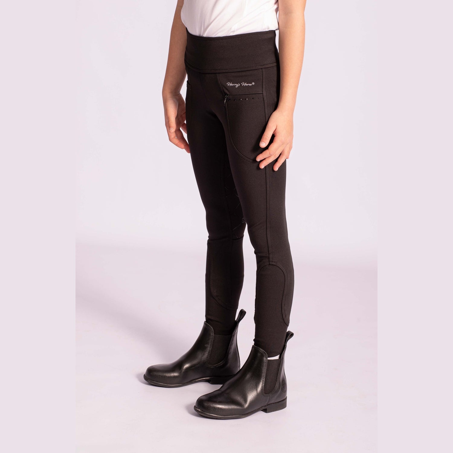 Paardrijlegging met twee zakken waarvan een met ritssluiting, kristallen details, zitvlak voorzien van een siliconen print voor extra grip in het zadel en met een elastische inzet rond de enkels.
