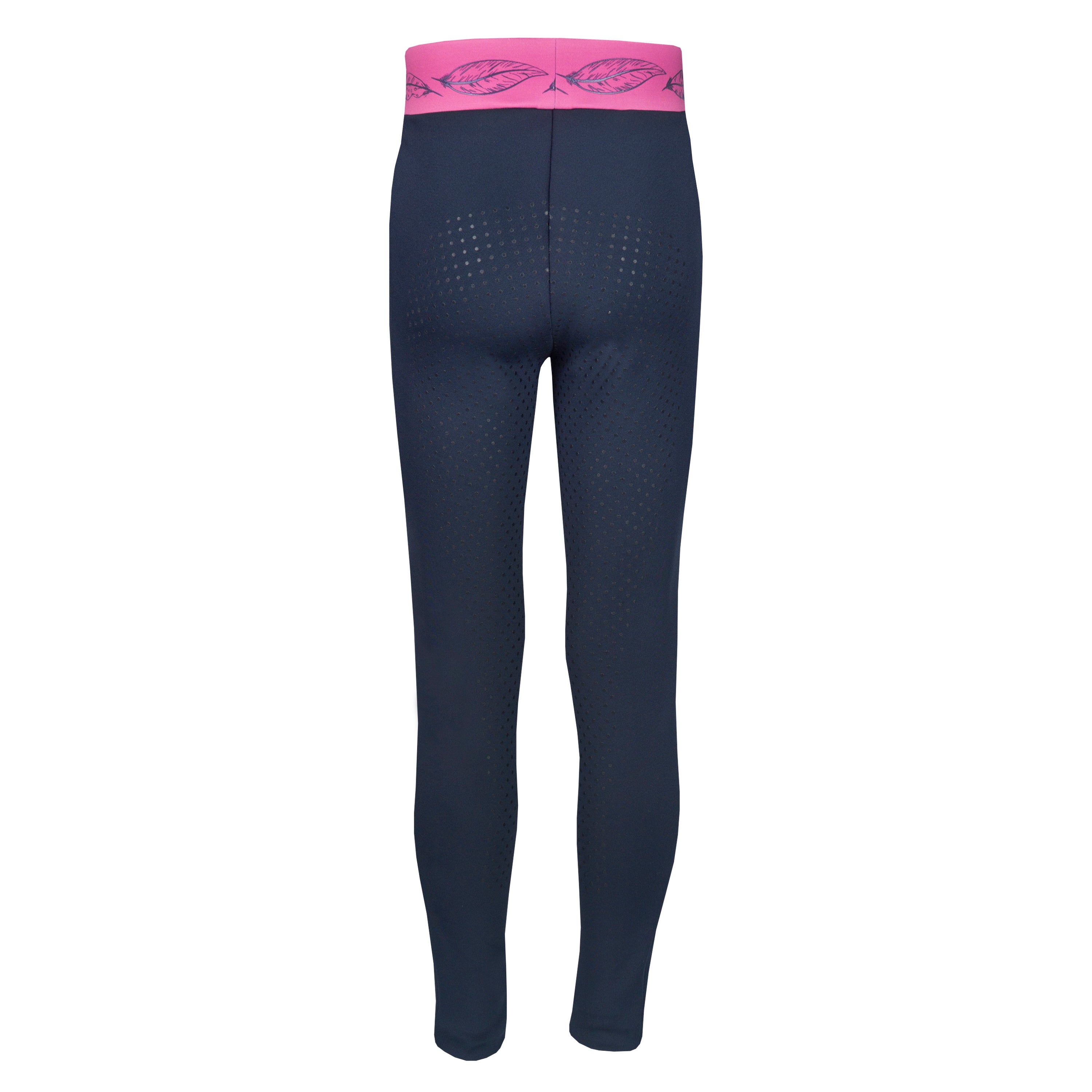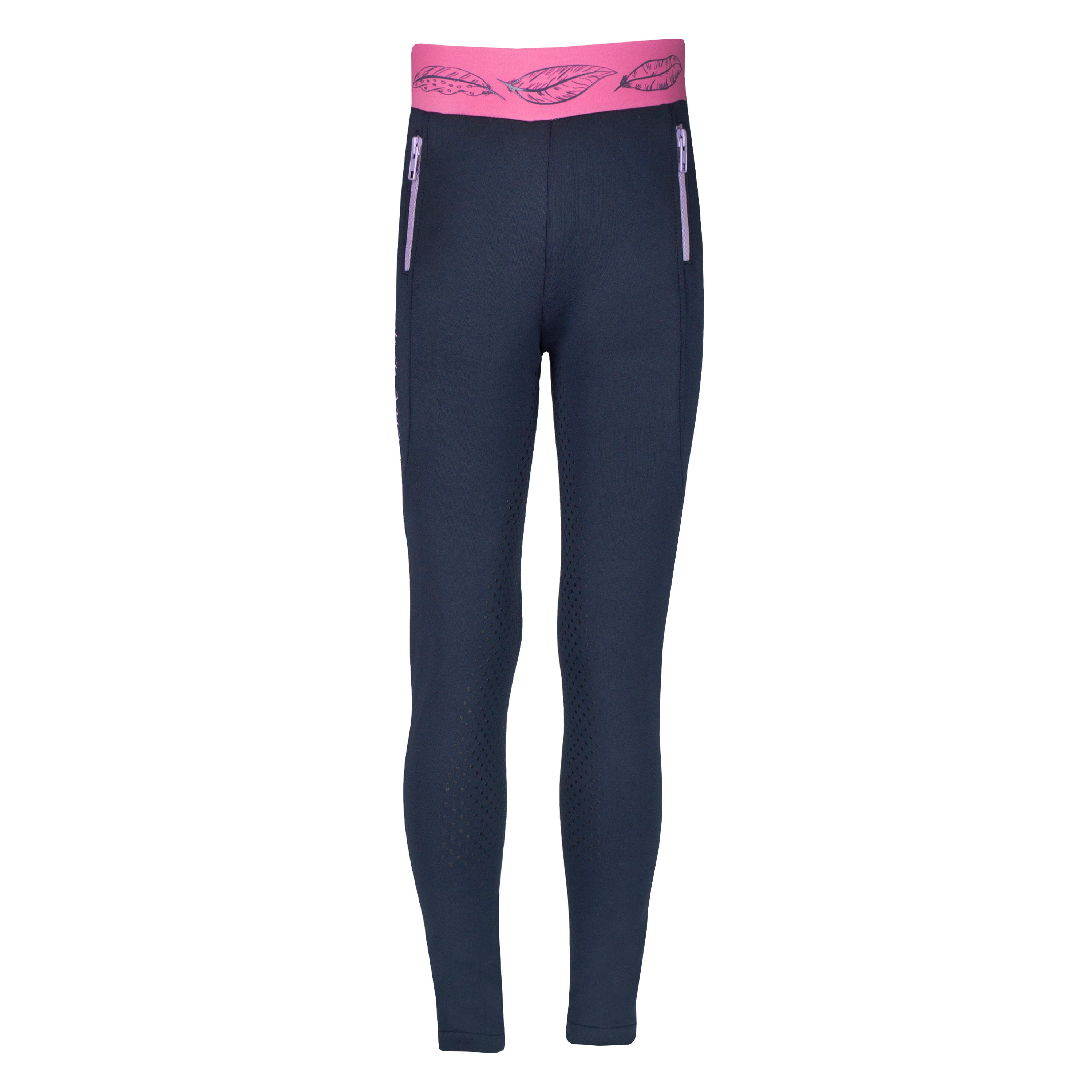 Junior rijlegging met volledig gestipt siliconen zitvlak en een tailleband met veren print. Productspecificaties:< Artwork in bohemian stijl op linker zijzak Veren print op tailleband Twee zakken met rits Volledig gestipt siliconen zitvlak Materiaal: < 96% Polyester 4% Spandex 320 gsm