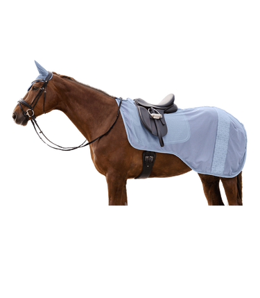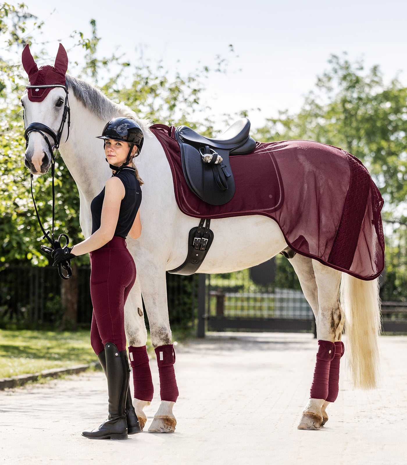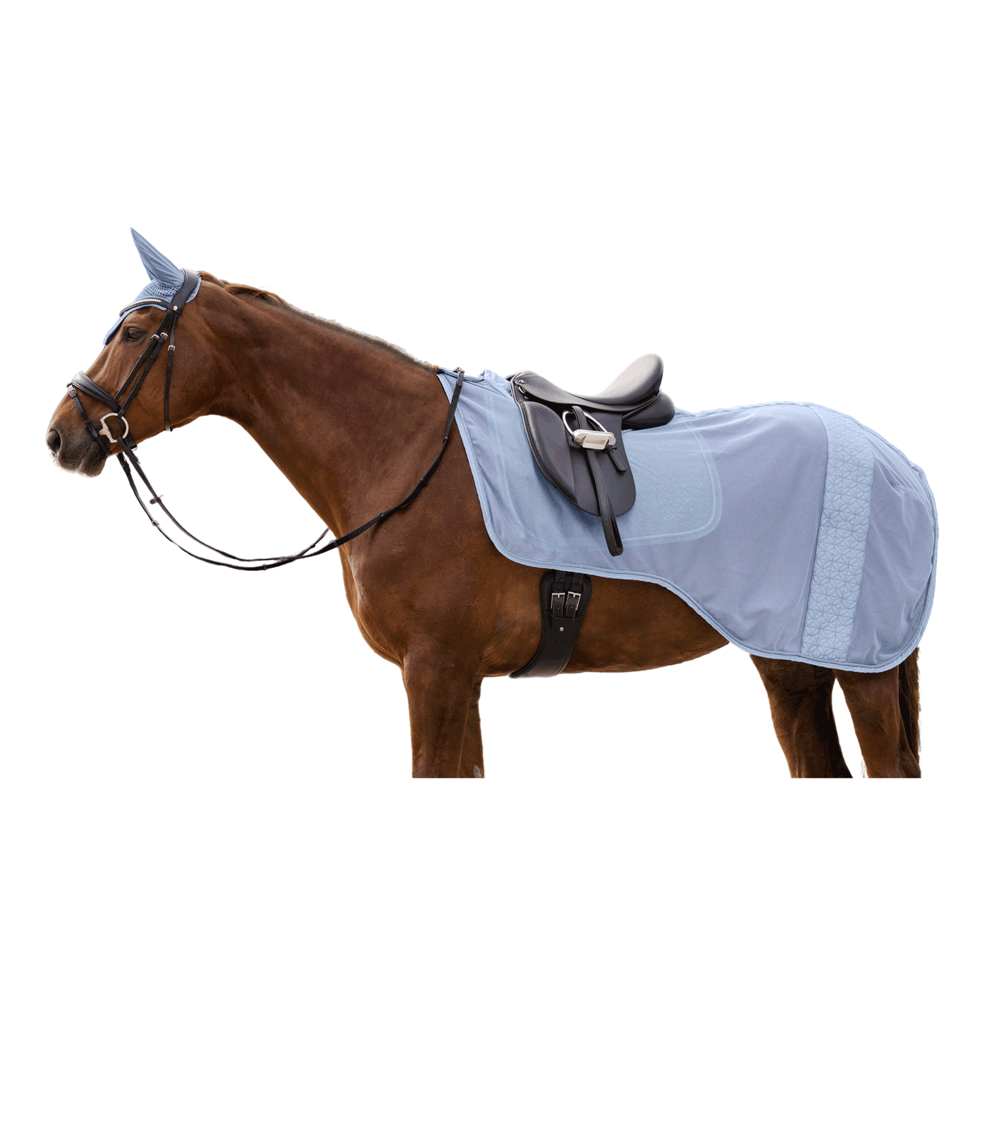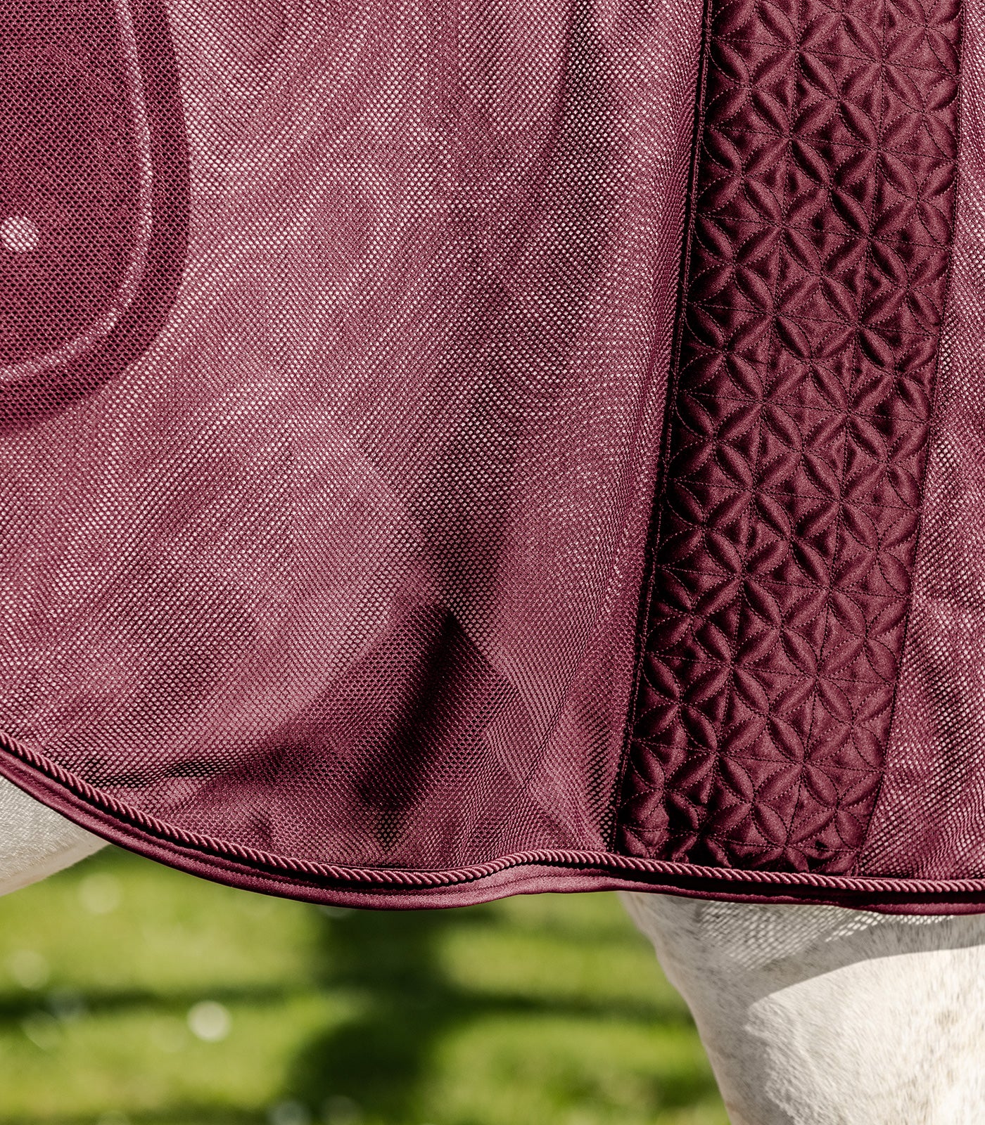 Elegante vliegendeken van ademend gaas met bloemeninzet. Met klittenbandsluiting om te openen bij de schoft en staartkoord. Passend bij onze Rome-collectie.