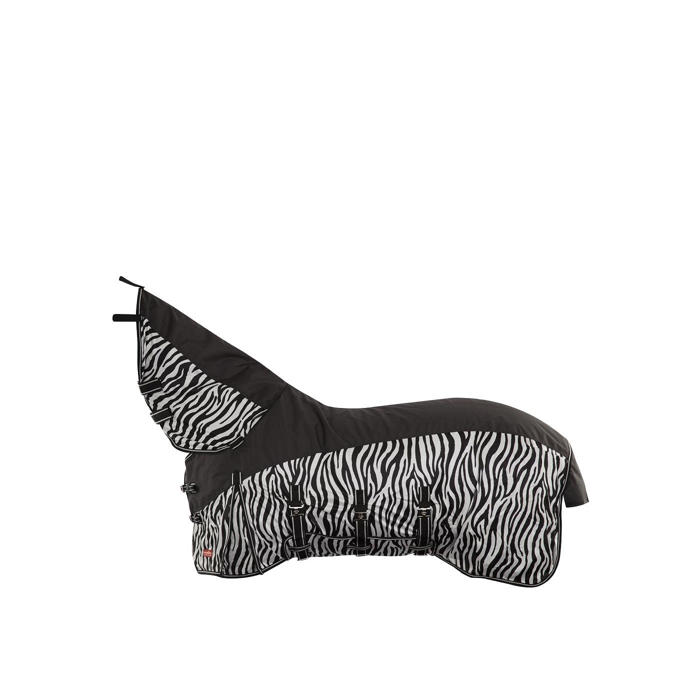 Deze innovatieve zomerdeken biedt het paard optimale bescherming tegen zowel regen, zon als insecten. De multifunctionele, anatomisch gevormde deken met hals is aan de bovenzijde voorzien van stevig 600D ademend polyester met een waterdichte coating, getapete naden en heeft een gladde voering van 190T nylon. Aan de onderzijde bestaat de deken uit 100% polyester mesh in zebramotief. Uit wetenschappelijk onderzoek is gebleken dat een zebramotief minder vliegen aantrekt. De deken is voorzien van een verstelbare dubbele borstsluiting, loopsplitten, elastische bilkoorden en een staartflap. Het vaste halsdeel is voorzien van een dubbele klittenbandsluiting en is uitgevoerd met een ge•ntegreerd stretchpaneel (waterdicht) ter hoogte van de schoft, dat zorgt voor extra bewegingsvrijheid en comfort voor het paard. Het halsdeel is met behulp van drie elastische klittenbandsluitingen te bevestigen aan het halster. De buik wordt volledig beschermd door de brede buikflap met drie verstelbare singels en klittenband. De deken is uitgerust met fournituren van zink met een matte, zilverkleurige finish. Machine wasbaar op 30¡C.