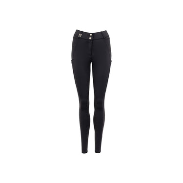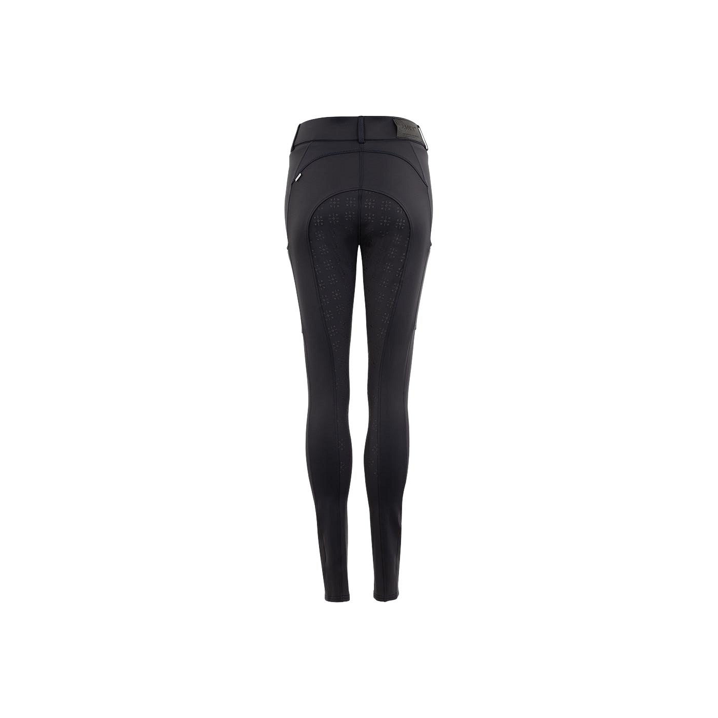 De rijbroek Prime beschikt over een handige haak-oogsluiting en diepe zijzakken geschikt voor je mobiele telefoon afgewerkt met donkerkleurige, glanzende, elastische tape. De matte siliconenprint op het zitvlak zorgt voor extra grip en een stabiele zit. De metalen knopen en het metalen logo op de riemlus maken de broek op elegante wijze af.