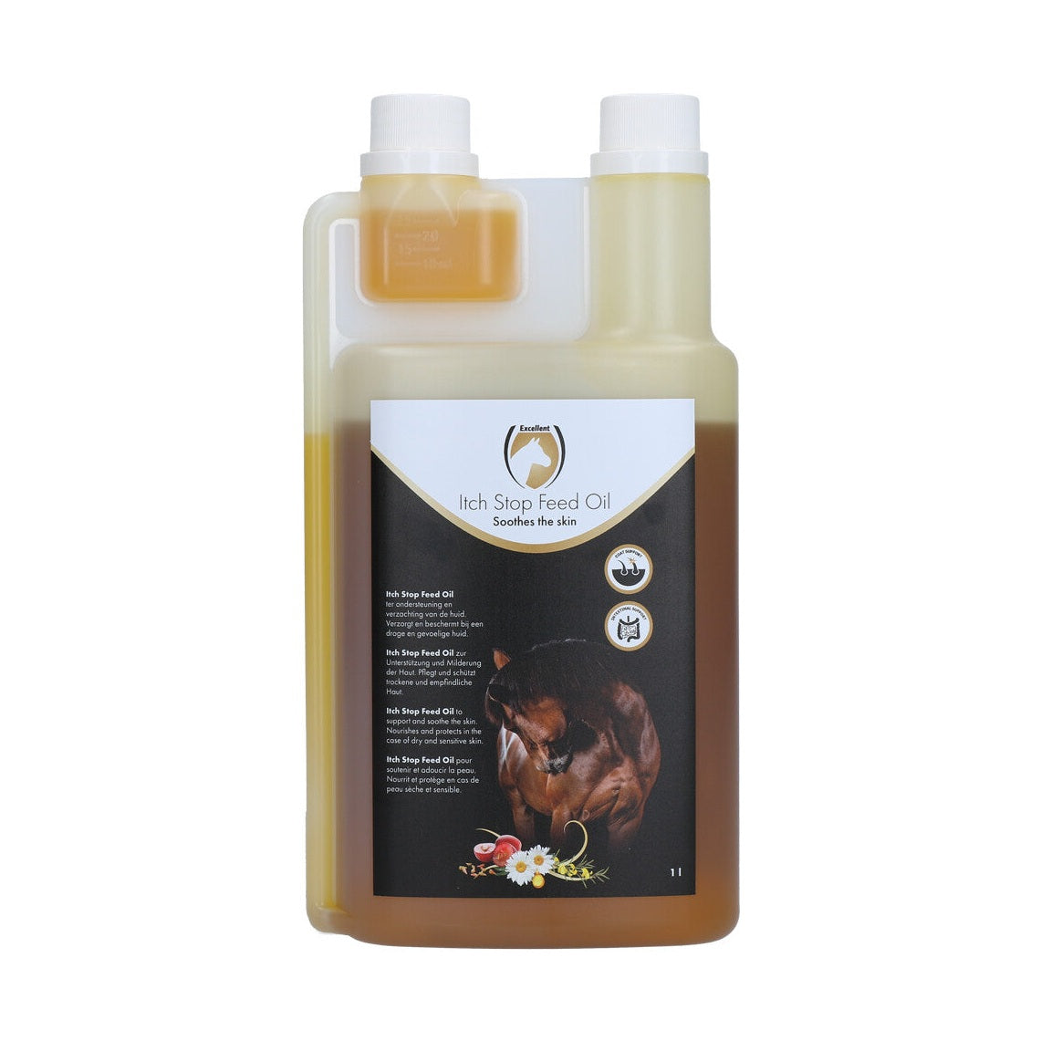 Itch Stop Feed Oil heeft verzorgende eigenschappen bij huidongemakken en gevoelige huid, met name tussen de manen, staart en onderbuik.