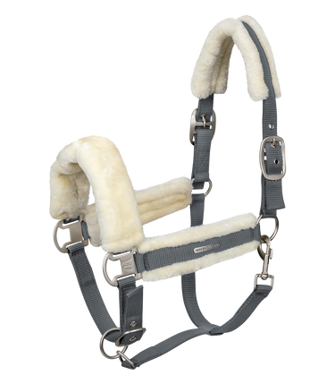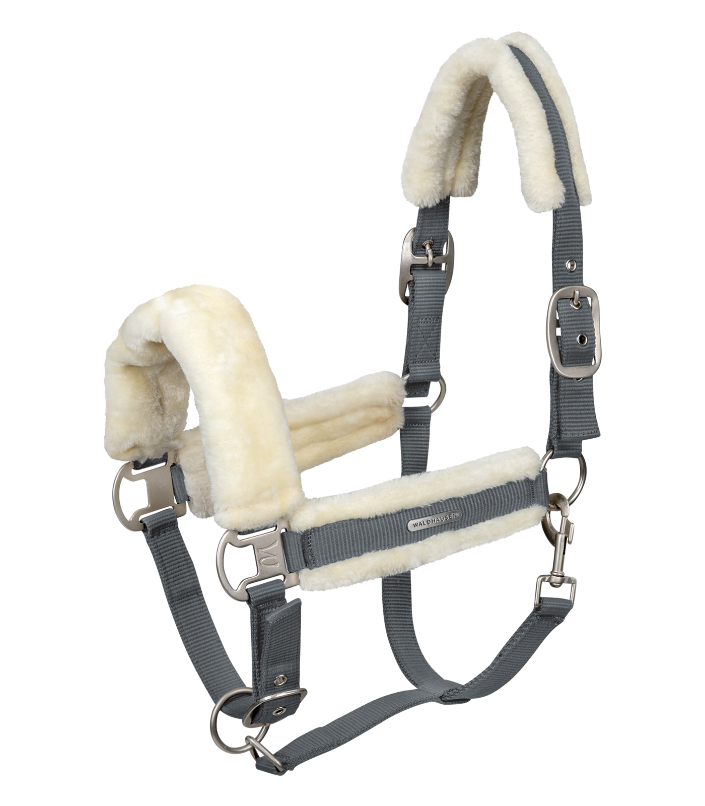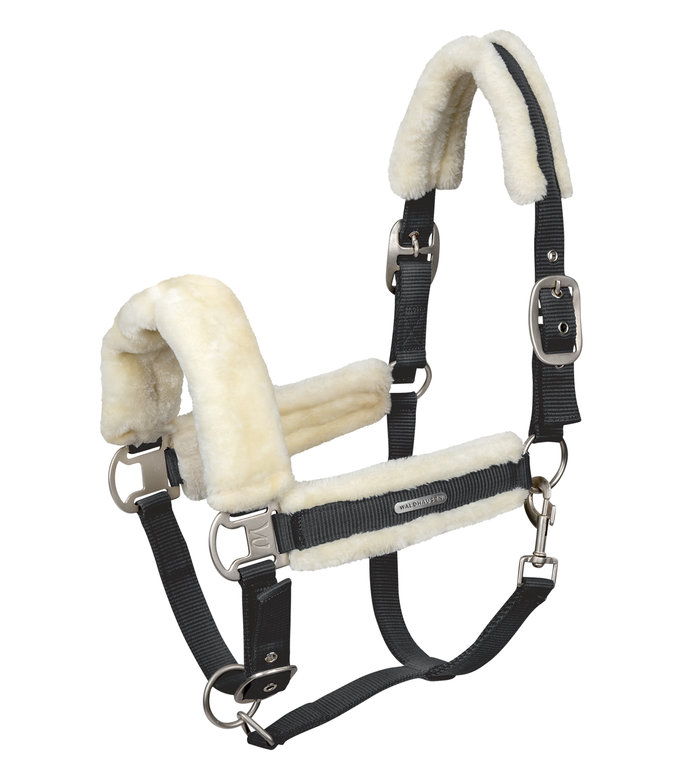 Quality halter with soft padding in synthetic fur on headpiece, noseband and cheekpieces. Easily adjustable at chinstrap and on both sides of headpiece. With matt silver-coloured fittings and silver-coloured Waldhausen logo.