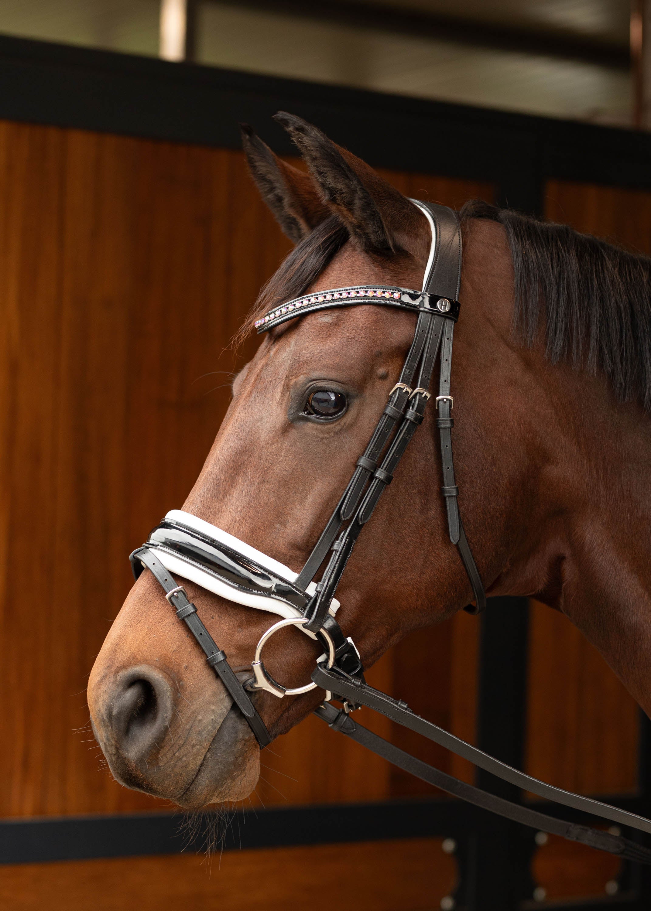 Lederen hoofdstel met gecombineerde neusriem. De luxe, brede aansnoerneusriem met lak is 4CM breed (incl. witte padding) en is anatomisch gevormd rond het bit. Met speciaal, anatomisch, zacht onderlegd kopstuk. Elegante smalle riempjes voor onder andere de keelriem. Uitgevoerd met luxe, hangende frontriem met lak en schitterende AB-kristallen. Blinde sluitingen aan bakstukken en teugels.