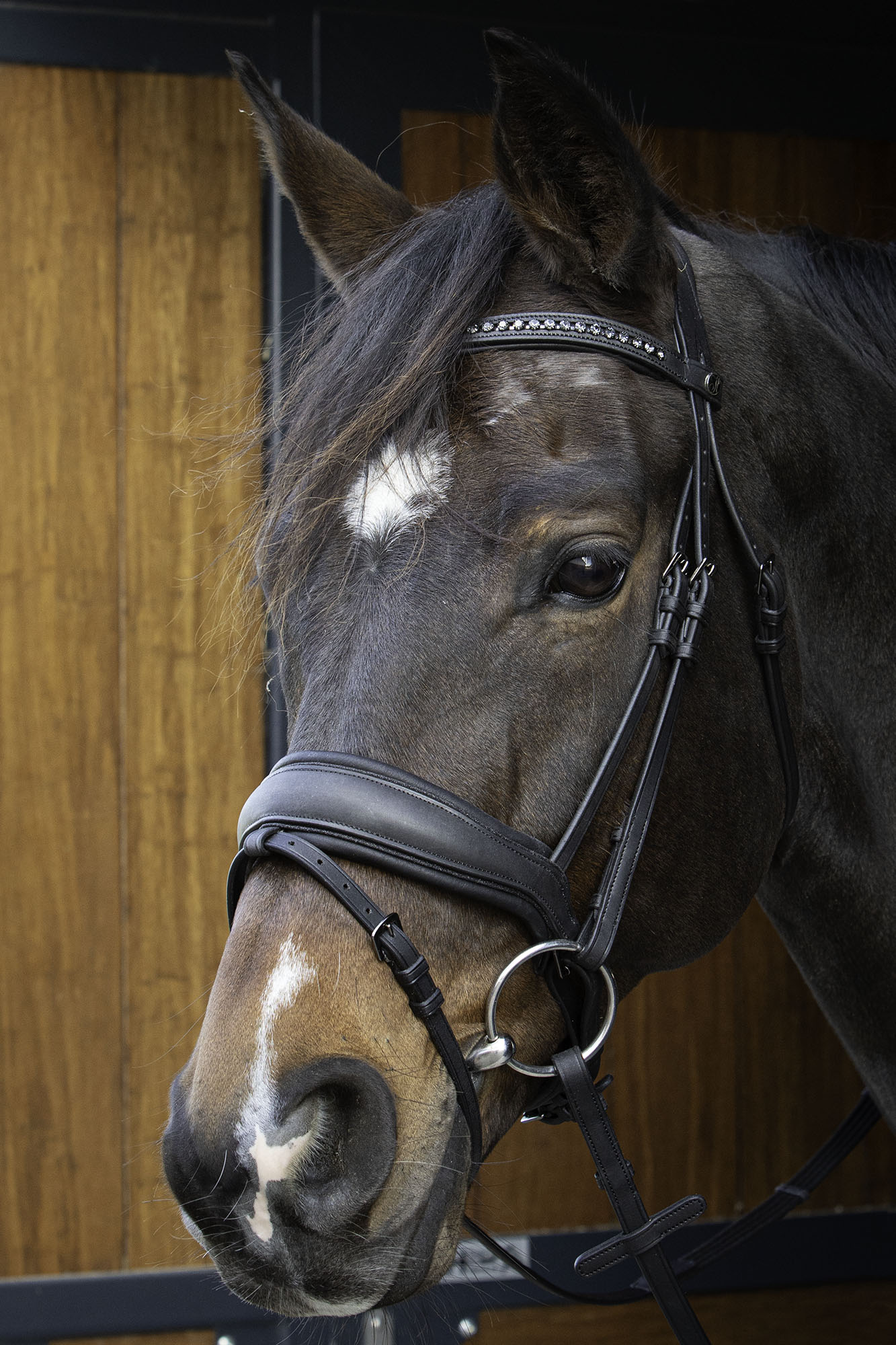 Comfortabel zacht leren hoofdstel, welke voorzien is van een anatomisch kopstuk en anatomische aansnoerneusriem, met kristallen op de frontriem, glitter piping langs de neusriem en gunmetal sluitingen. Inclusief teugels welke voorzien zijn van blinde sluitingen.