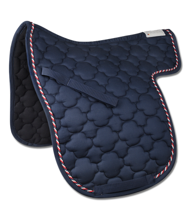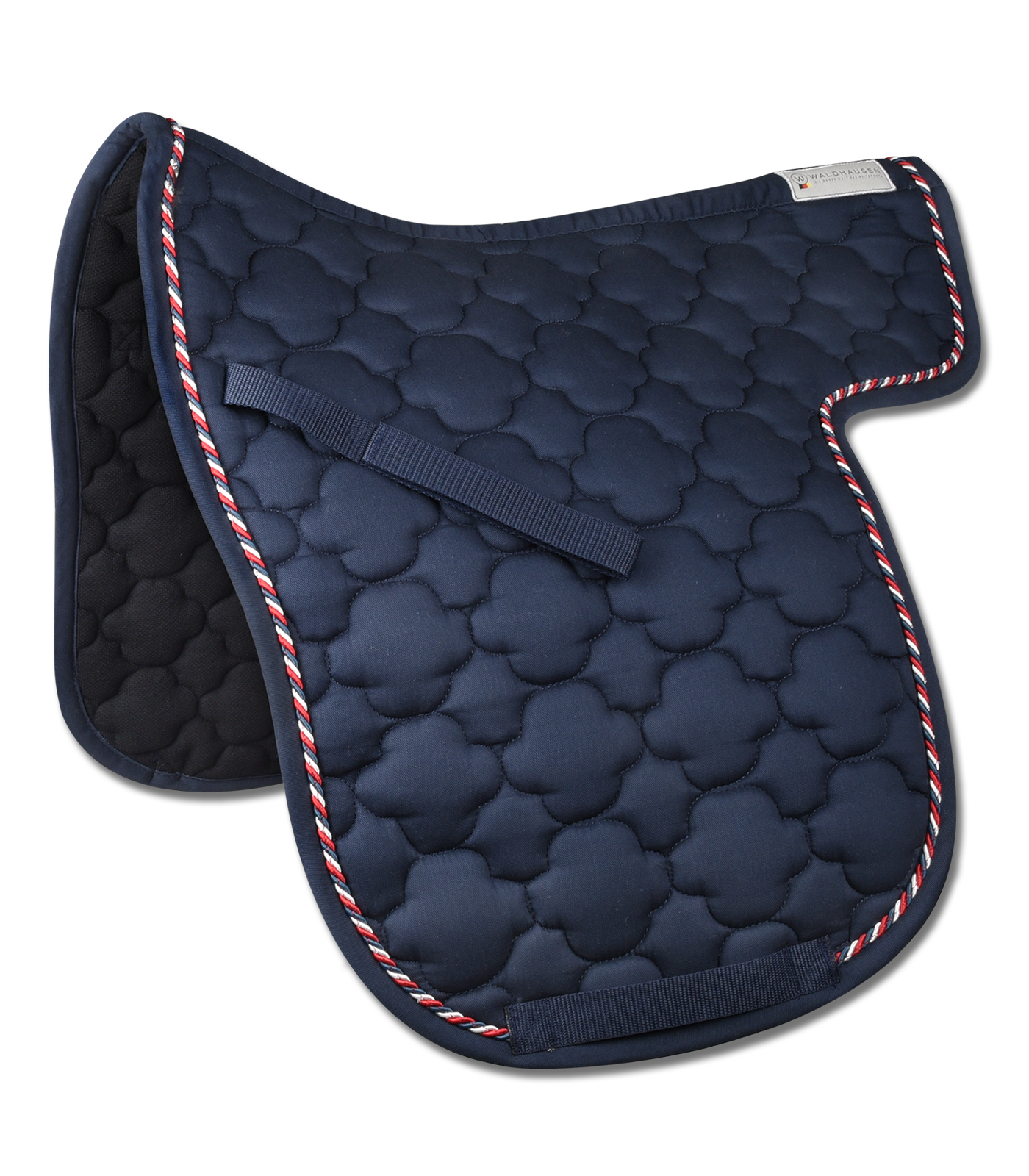 Anatomically shaped saddle pad with floral quilting and decorative cord. The underside is made from sweat-absorbent and breathable material. 300 g/m² padding and 8mm foam ensure outstanding pressure distribution and shock absorption. Loops for girth and saddle with practical Velcro fastener.