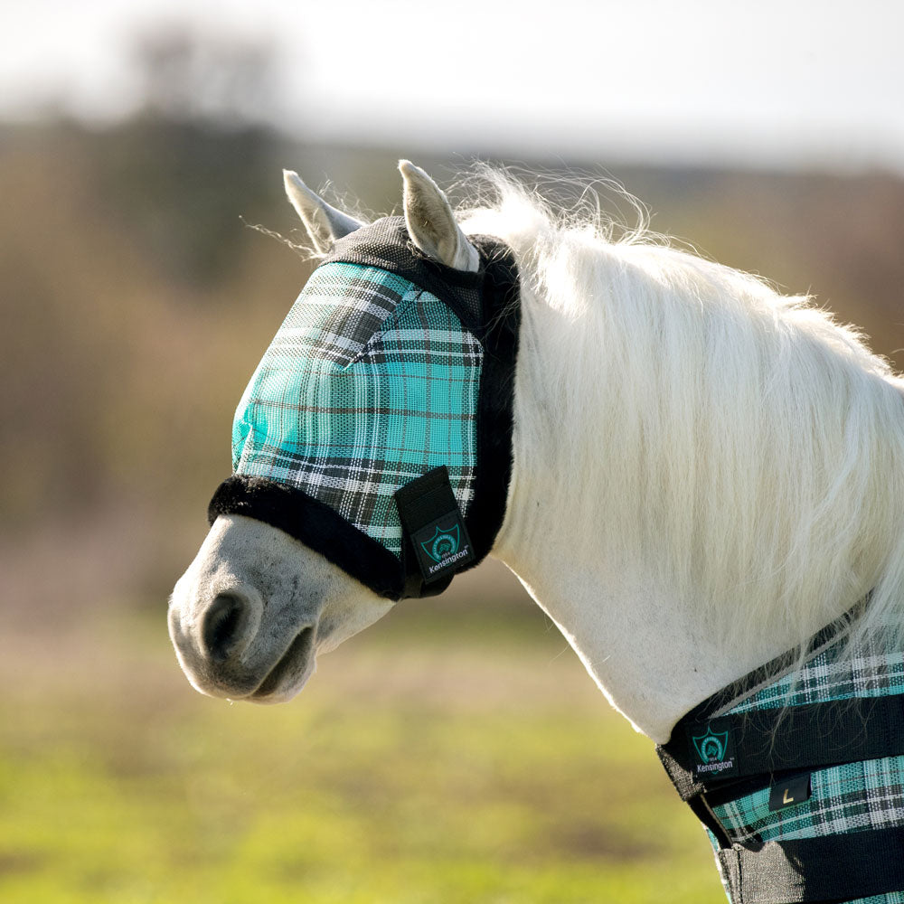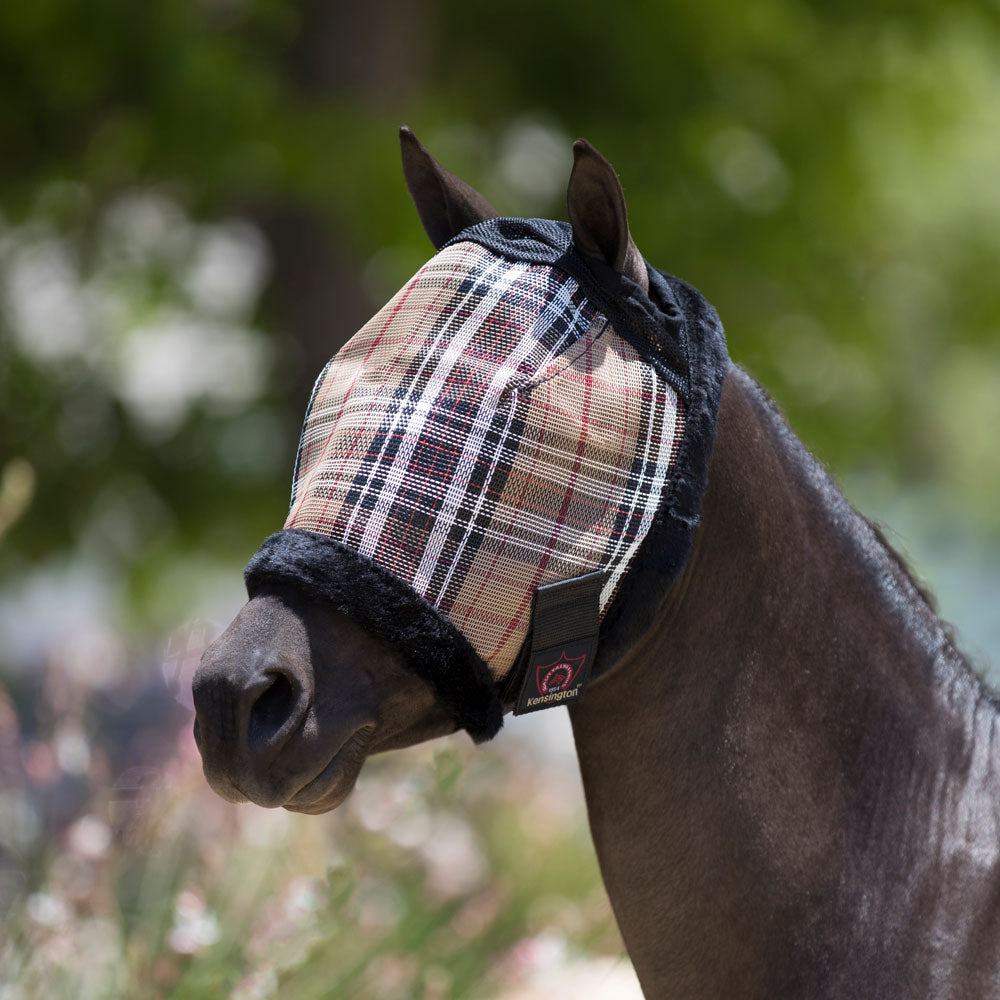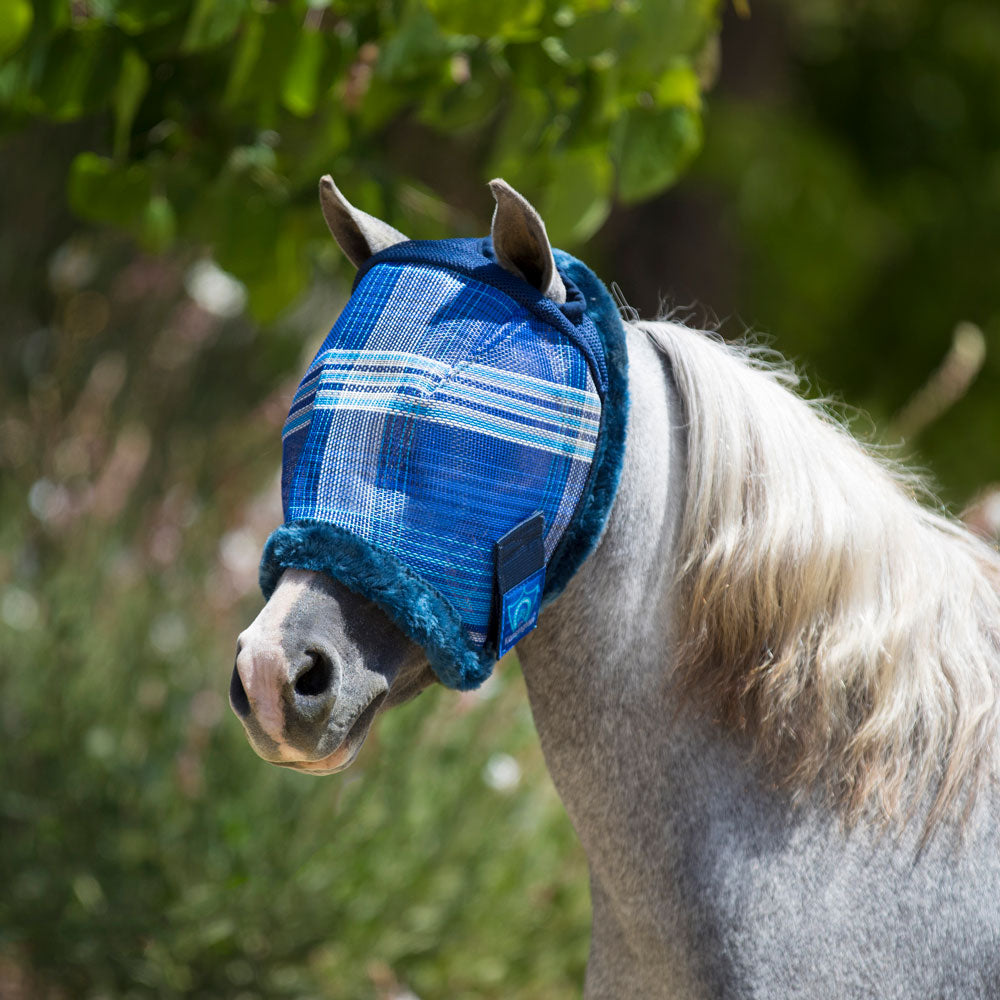 Erg mooi vliegenmasker met een zachte fleece rand voor extra draagcomfort. Beschermt uw paard z'n ogen tegen insecten en vuil en is tevens 78% UV-straling werend. Dit vliegenmasker is verstelbaar onder de kaak zodat hij goed blijft zitten. Sluiting is met velcro klittenband. Deze maskers passen o.a. goed bij de Kensington T vliegendekens.
