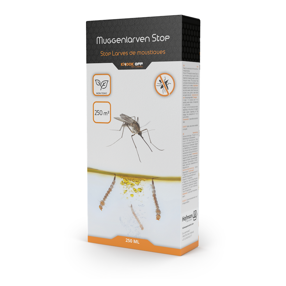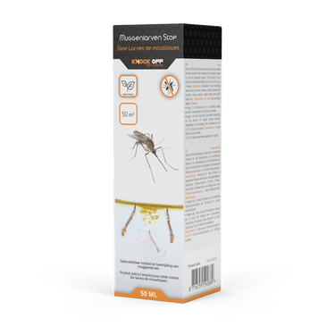 Knock Off Muggenlarven Stop is verkrijgbaar in twee verschillende inhoudsmaten: 50 ml en 250 ml.