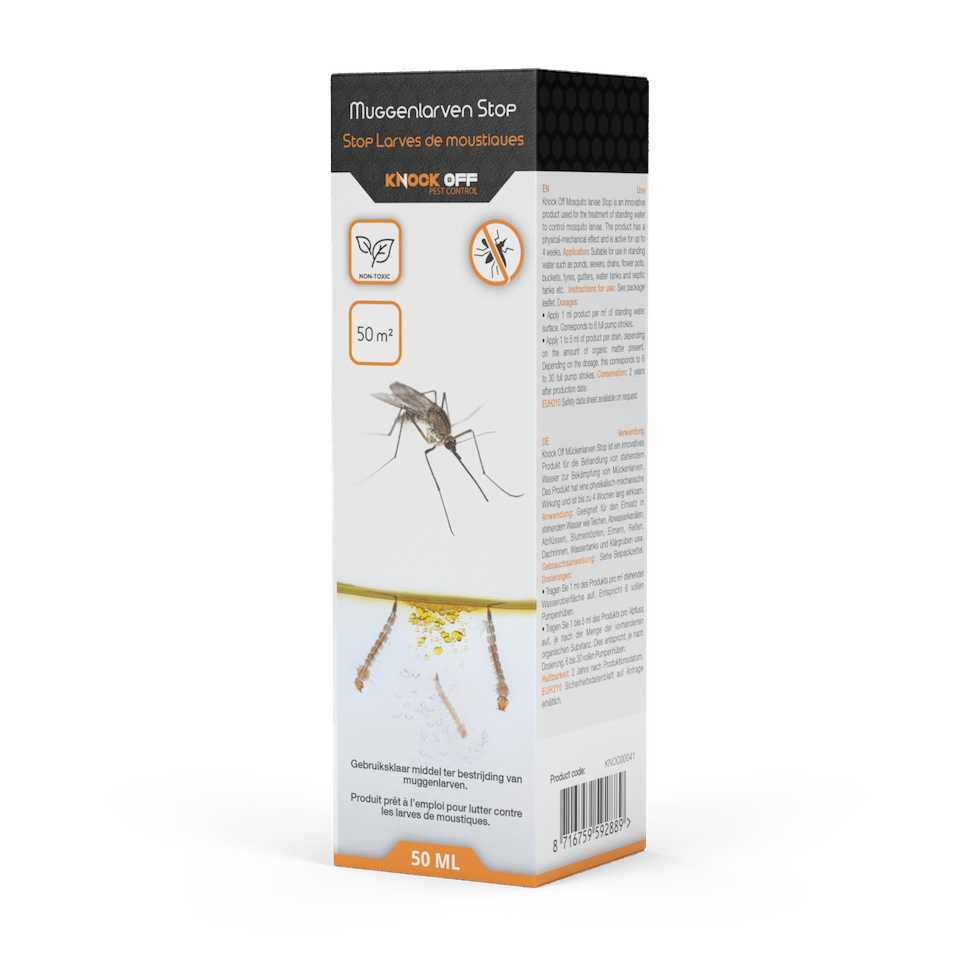 Knock Off Muggenlarven Stop is een innovatief en gebruiksklaar middel dat speciaal is ontwikkeld voor de bestrijding van muggenlarven in stilstaand water. Het middel heeft een fysisch-mechanische werking en is effectief gedurende maximaal 4 weken. Het is gebaseerd op een snel biologisch afbreekbare plantaardige olie (OECD 301 B), is siliconenvrij en bevat geen insecticide. Hierdoor veroorzaakt het geen minder gevoeligheid of resistentie.