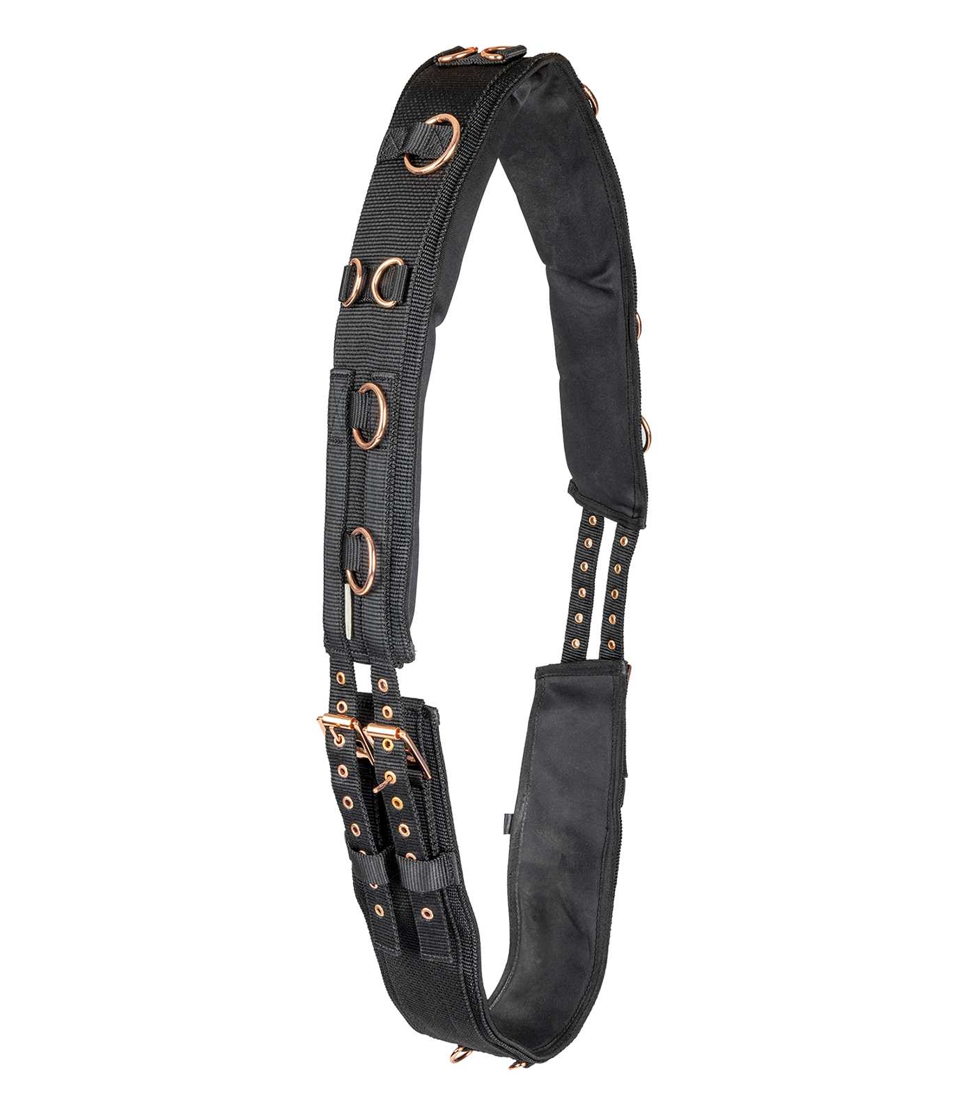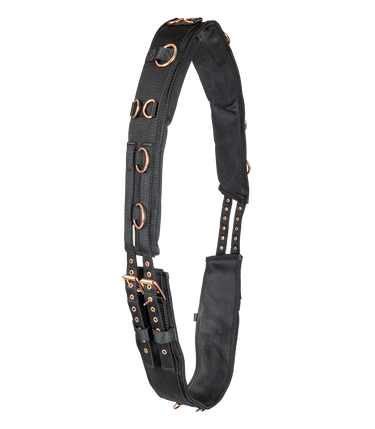 Extra-soft lunging surcingle, which provides the horse with a high degree of comfort. The girth circumference is easily adjustable with the aid of the two roller buckles. With 12 rings for individual lunging management. With rose-gold fittings.
