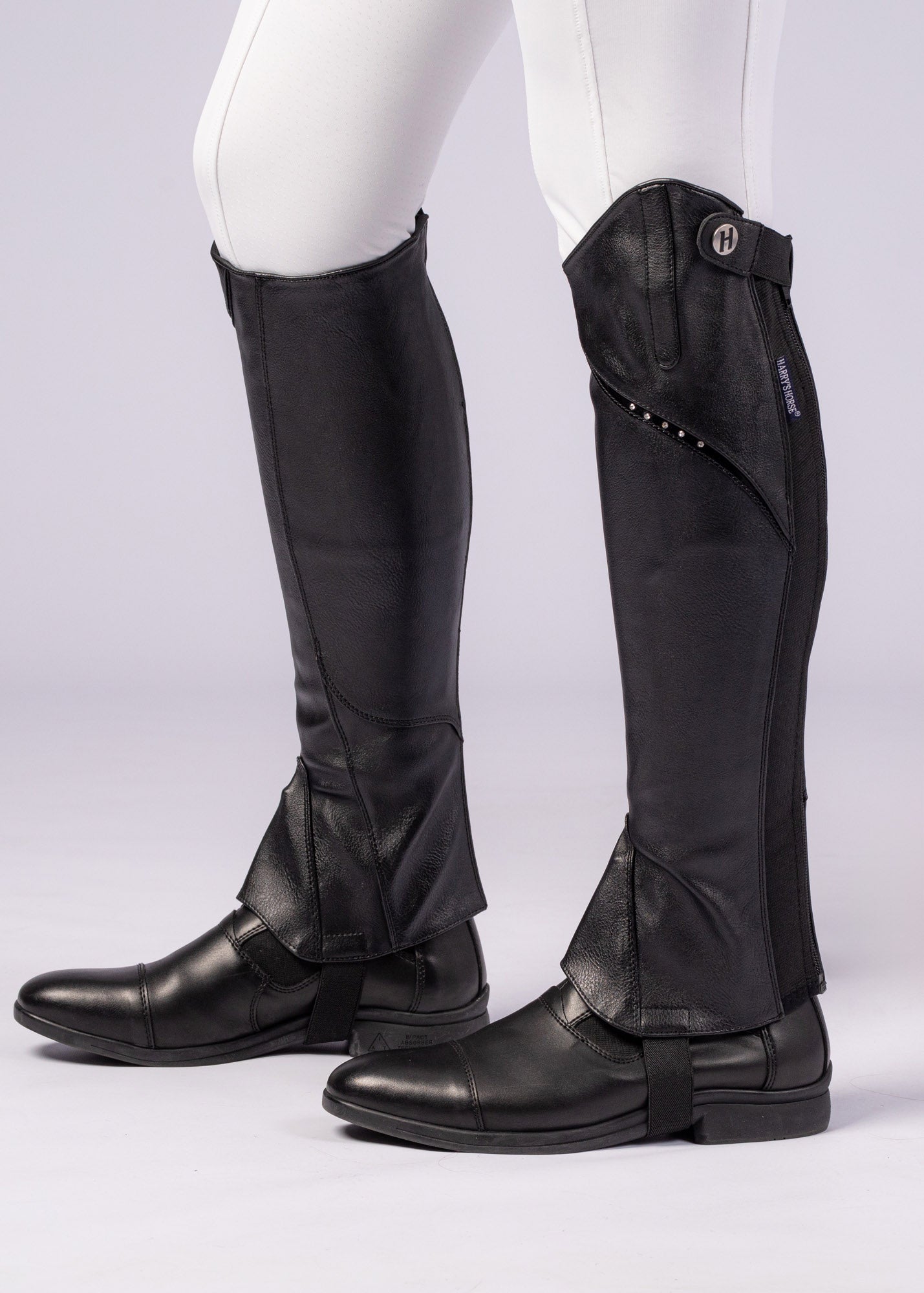 Luxe en soepele minichap met een elastisch kuitgedeelte. Uitgevoerd met schitterende kristallen en een laklederen decoratie. Vervaardigd uit Microtouch PU leather.