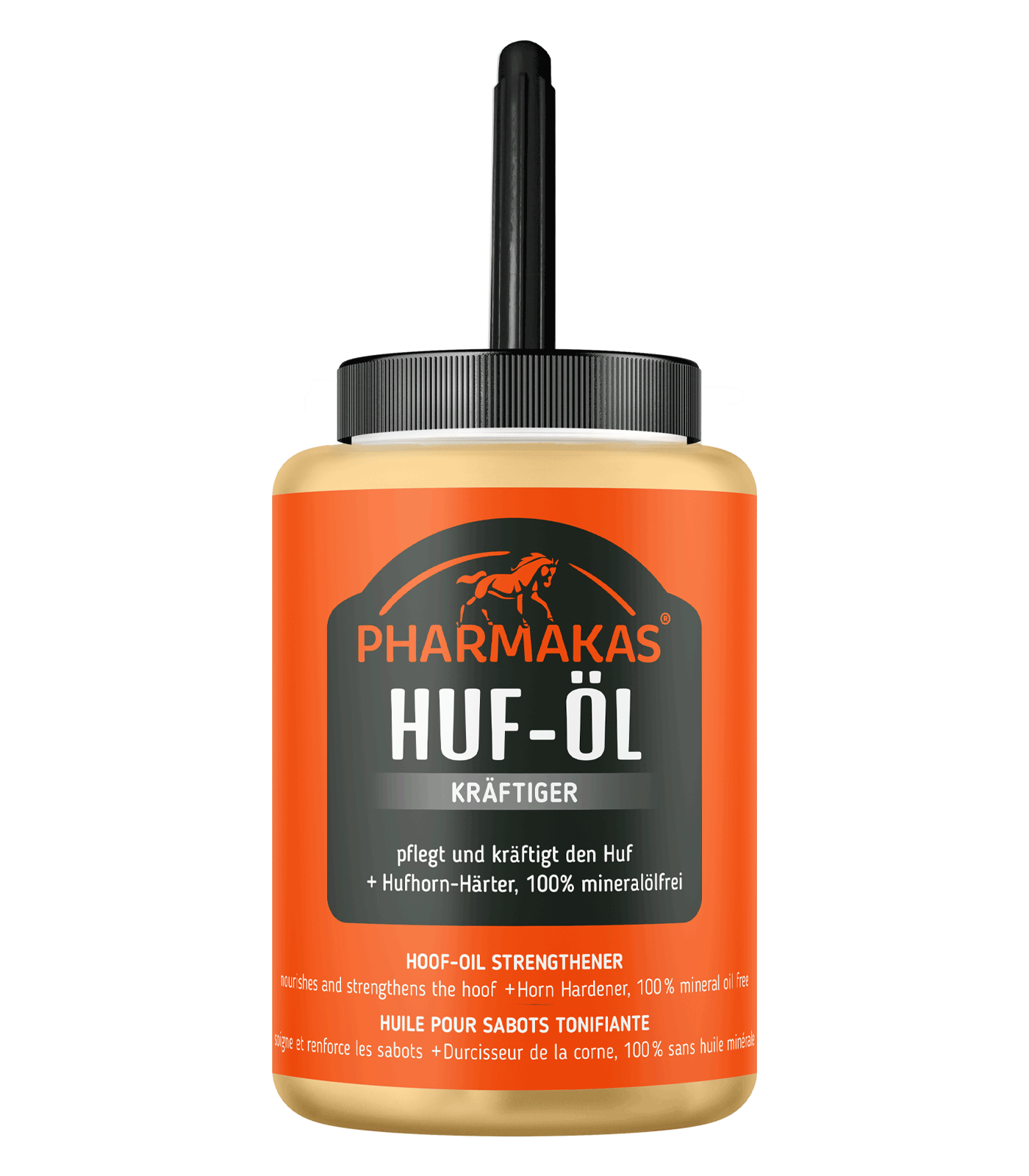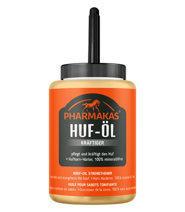 Pharmakas® Hoof Oil Strengthener nourishes with a natural oil complex. High-quality ingredients strengthen the hoof horn and maintain the natural moisture balance. It is absorbed quickly, is 100% mineral oil-free and has a pleasant smell of oranges. Ideally suited for use as a treatment or for daily care. It is easy and hygienic to use due to the integrated brush. Suitable for all hoof types.