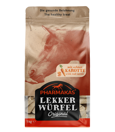 Pharmakas® Carrot Treat Cubes are the healthy reward for increasing reciprocal trust between animal and human. They only contain real fruit, carefully selected ingredients of the highest quality, important vitamins and minerals as well as quality trace elements and a lot of fibre. A conscious decision was made to do without flavourings and colouring. Naturally, the treat cubes are free of animal raw materials. Pharmakas® treat cubes also encourage natural chewing. The elaborate production process ensures that the treat cubes remain crunchy and fresh, and thus provide even more biting and chewing entertainment for horses. Horse lovers have been trusting this healthy reward for decades!