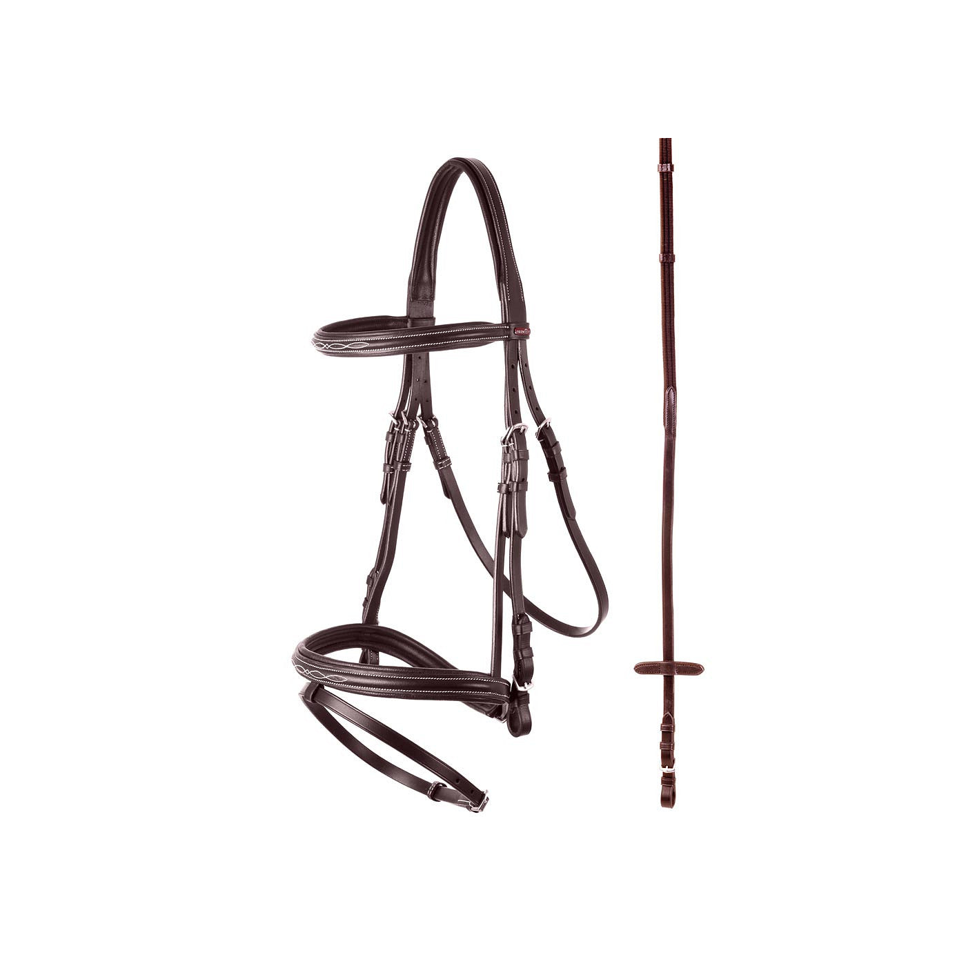 Symmetrisch hoofdstel met een anatomisch gevormd, zacht gevoerd kopstuk dat aan beide zijden is teruggesneden voor extra vrijheid. Het rechte frondeel is rond gebombeerd en zacht gevoerd en is voorzien van cr�mekleurig sierstiksel. De smalle (circa 2.5 cm) gecombineerde neusriem is rond gebombeerd en zacht gevoerd en is voorzien van cr�mekleurig sierstiksel. Het hoofdstel is voorzien van roestvrijstalen fournituren. De bijgeleverde linnen teugel heeft hand- en teugelstops.