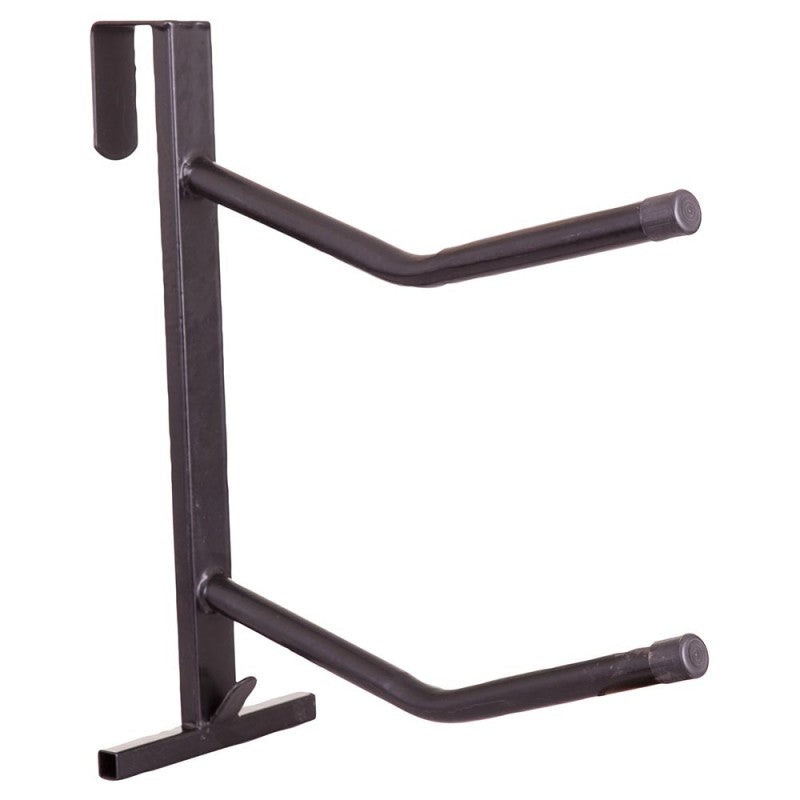 Geplastificeerde buisframe zadeldrager met haak die over bijna iedere rand gehangen kan worden. Geschikt voor twee zadels.