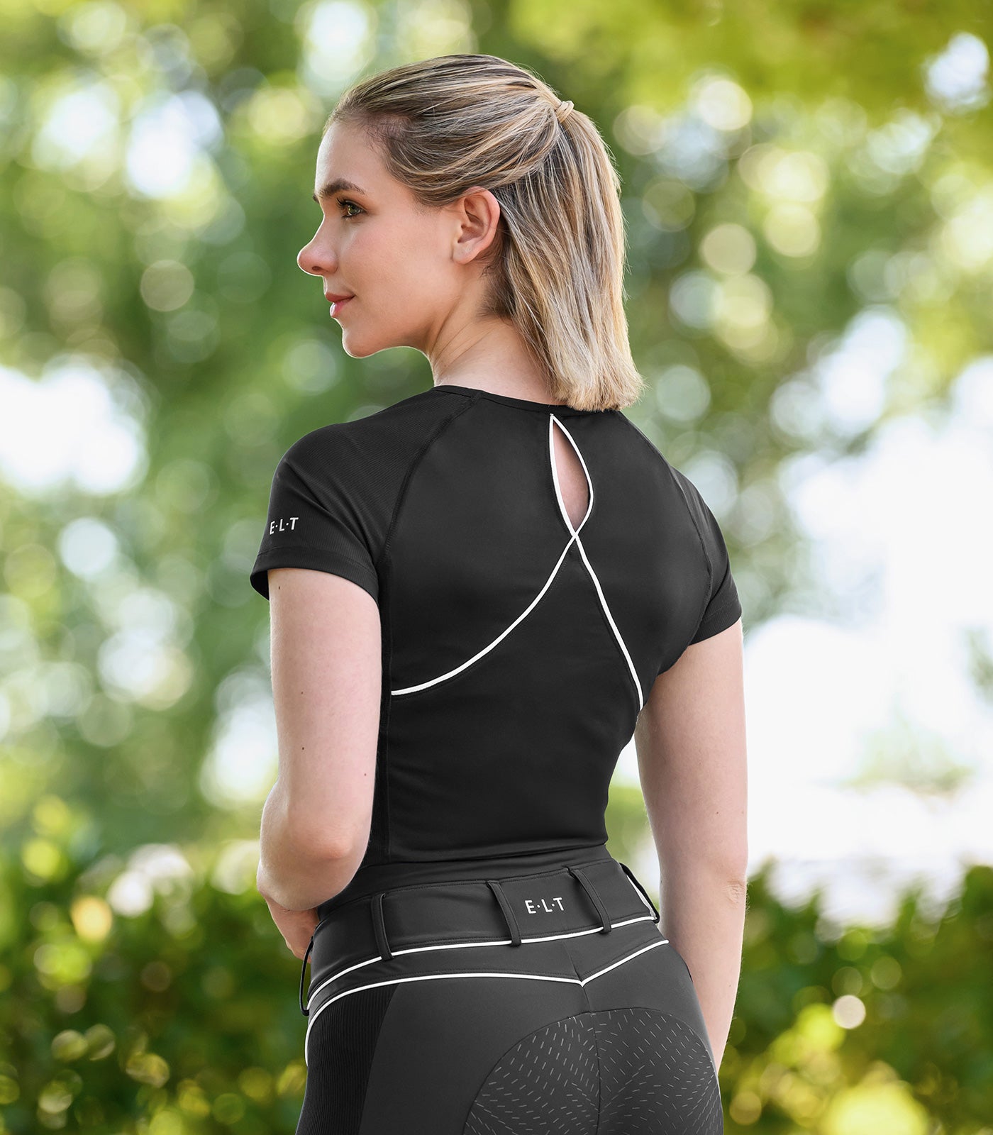 - E·L·T-letters als rubberen print op het telefoonzakje en de achterkant van de tailleband