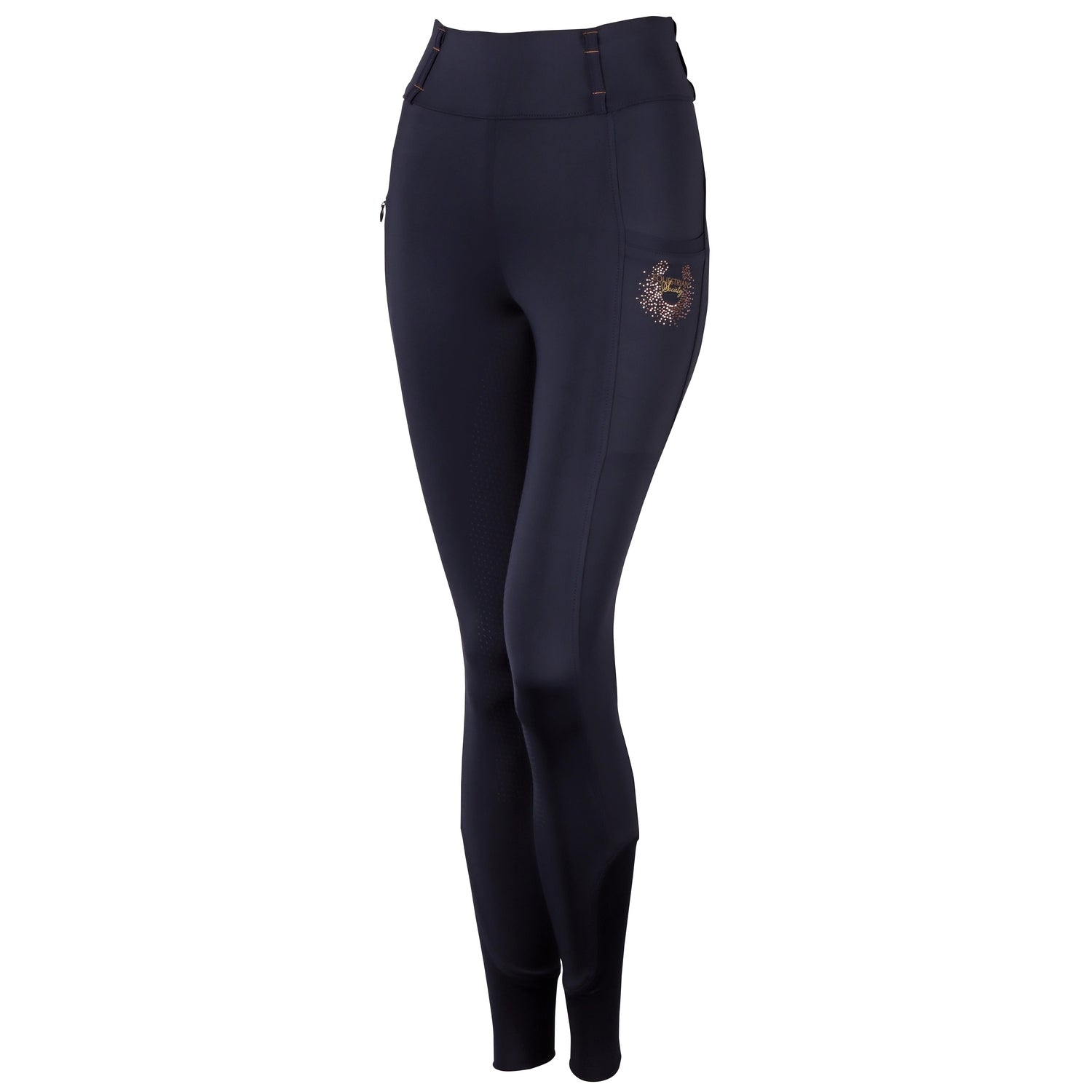 Paardrijlegging met een leuke gestreepte tailleband aan de achterzijde, riemlussen, twee zakken waarvan een met een ritssluiting, Equestrian Society logo op de linkerzak, rondgenaaid zitvlak met een siliconen print voor extra grip in het zadel en een comfortabele elastische inzet rond de enkels.