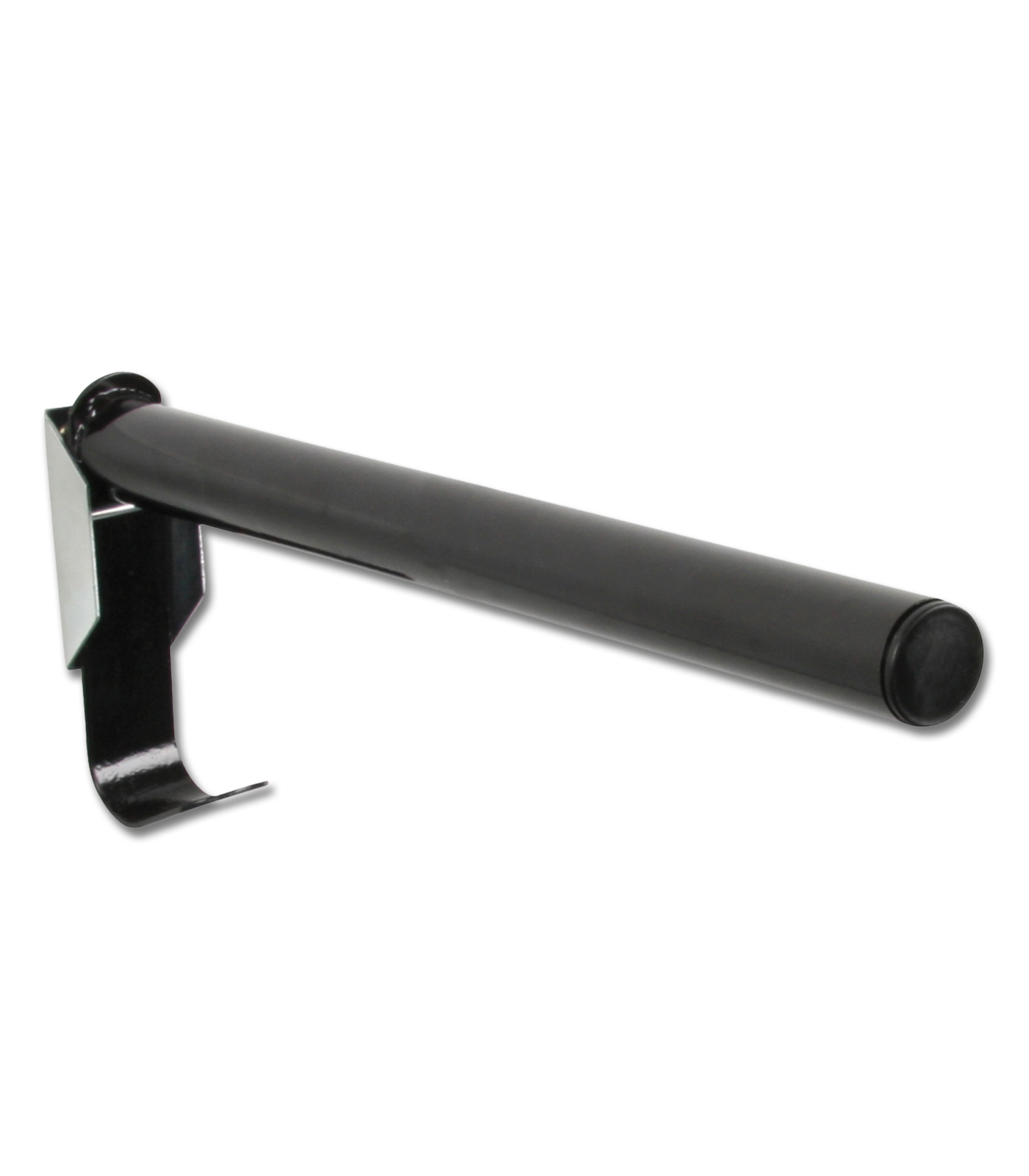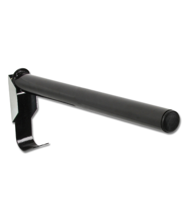 Round saddle rack with a rubber end. When not in use, the rack can be folded down to save space. Includes hook for the bridle.